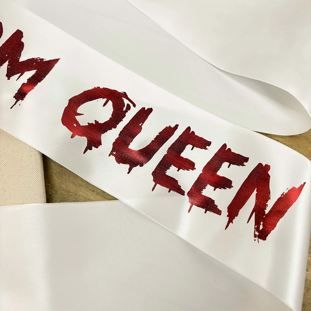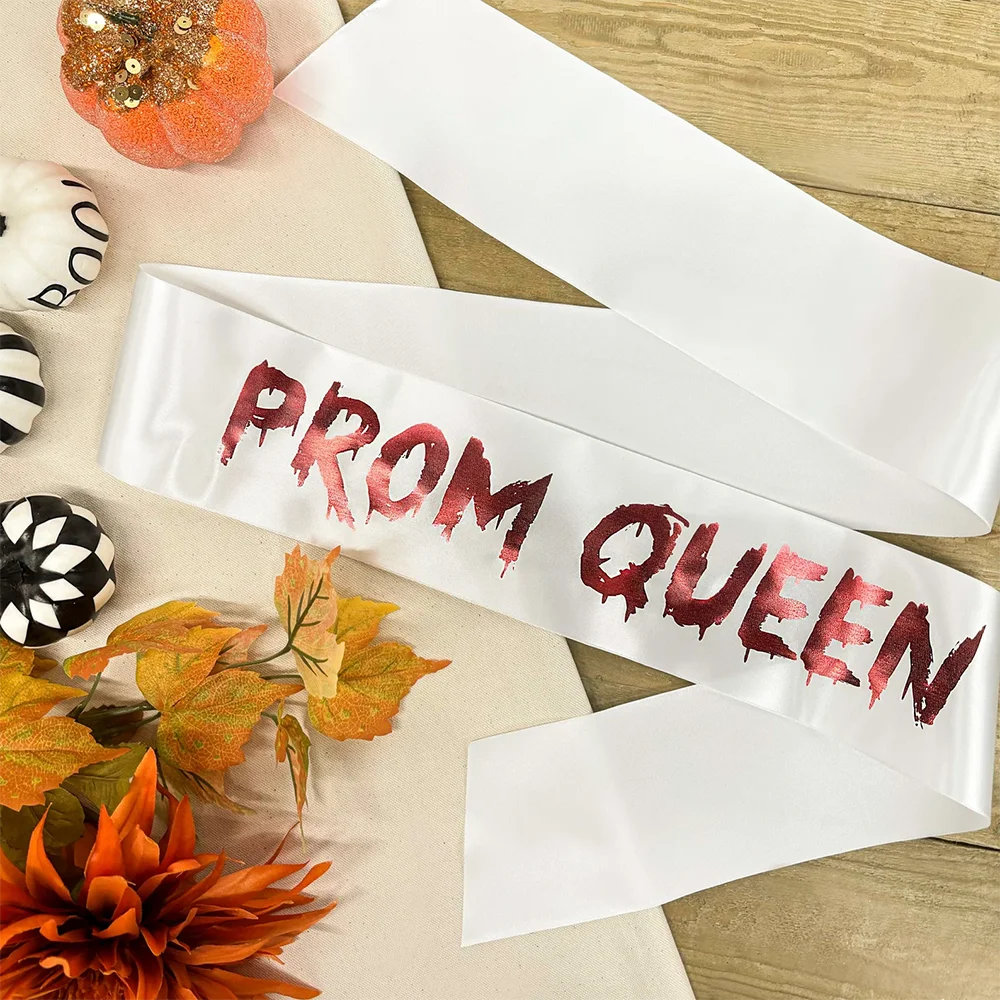 O ousado texto “Prom Queen” é impresso em vermelho metálico brilhante para um acabamento marcante e sofisticado.O material acetinado de face única proporciona uma sensação suave e premium, tornando-o um acessório de destaque para o Halloween ou festas temáticas.