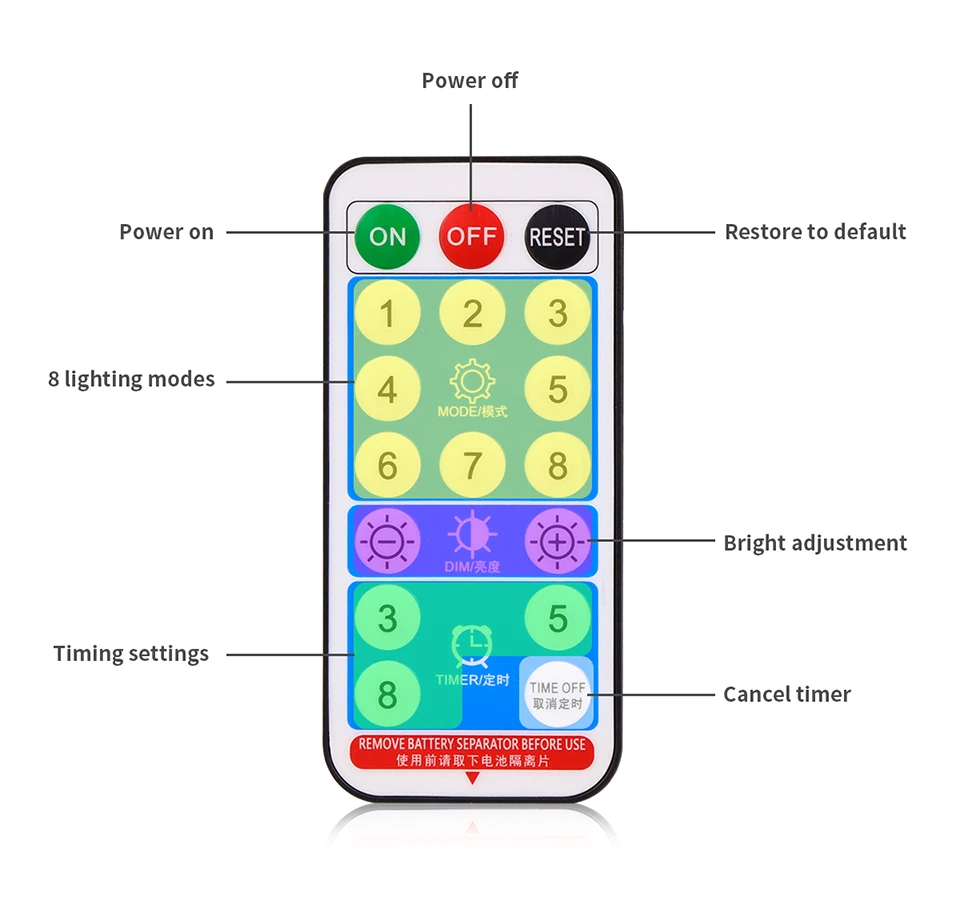【Controle remoto multifuncional】 O controle remoto RF de 17 teclas tem 8 botões diferentes; Modelo brilhante (brilho/brilho+); modos de temporizador (3 horas ligados/5 horas/8 horas ligados).Você pode escolher o modo para atender às suas diferentes cenas
