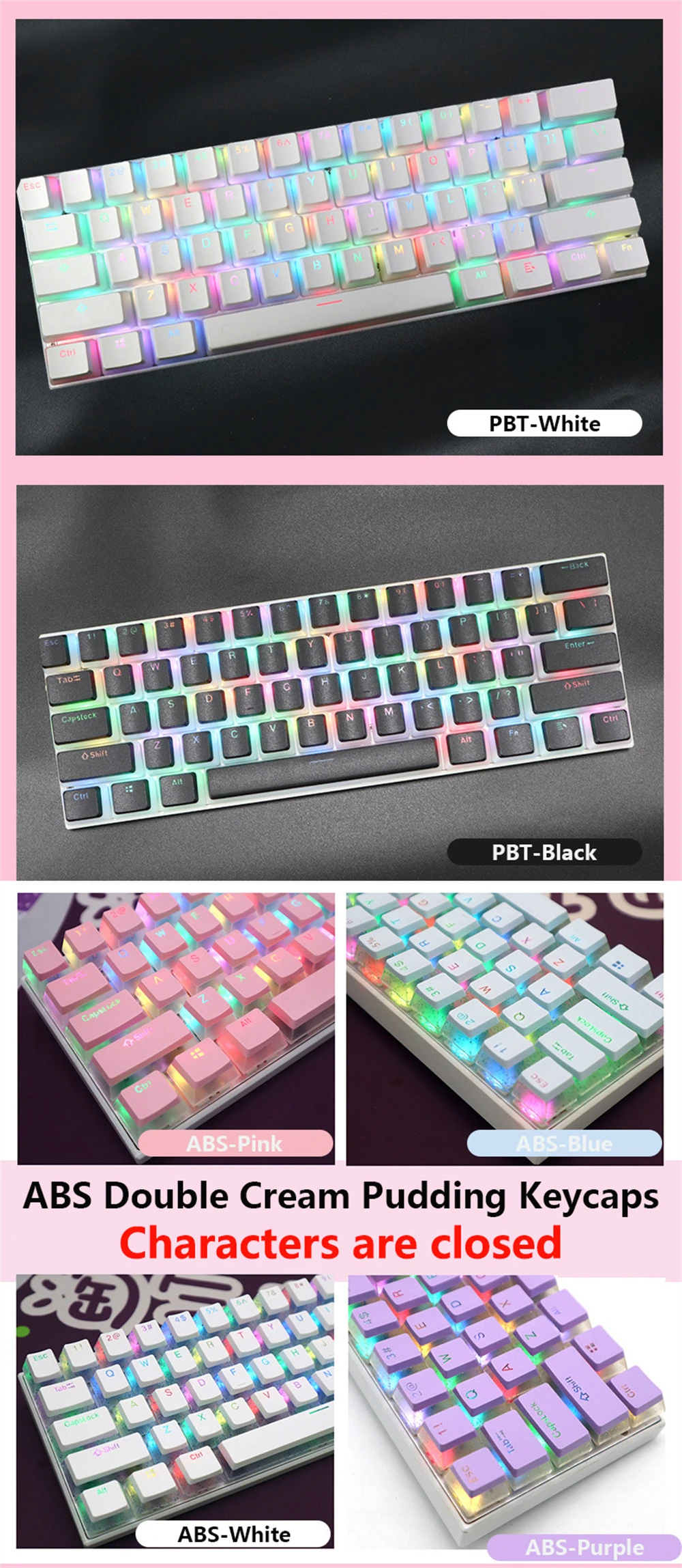 The linked product is pudding double-leather milk keycap, with closed characters, good light transmission effect and delicate hand feel, suitable for L61/87/104 key standard layout mechanical keyboard