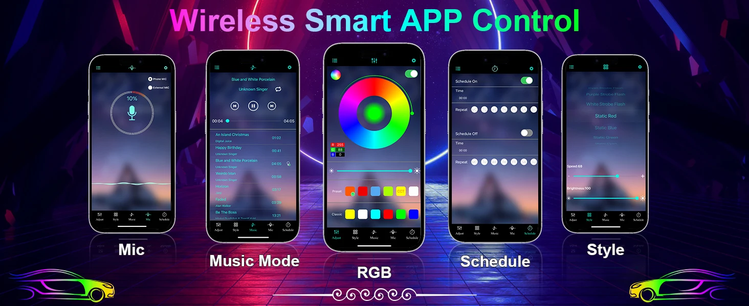 5) você pode facilmente ligar e desligar as luzes e ajustar efeitos de iluminação, cores, tempo e brilho.Este recurso de controle sem fio adiciona conveniência e garante sua segurança ao dirigir.