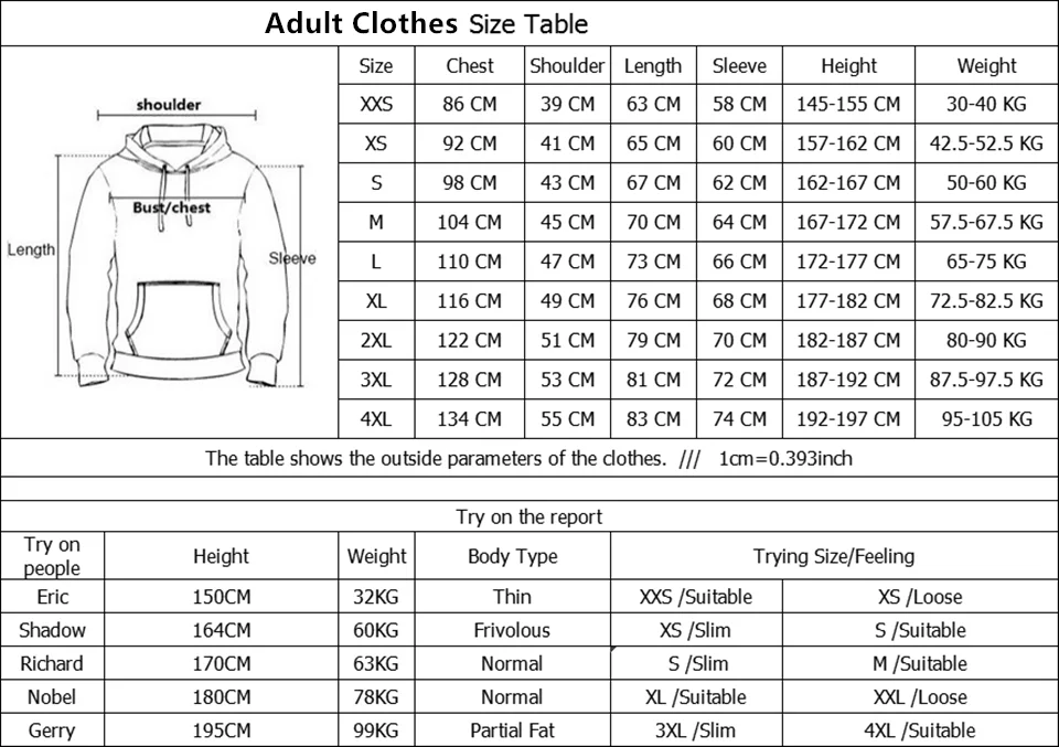 2).Meça o comprimento real dos seus moletons, peito, ombro... etc., compare com nossa tabela de tamanhos.