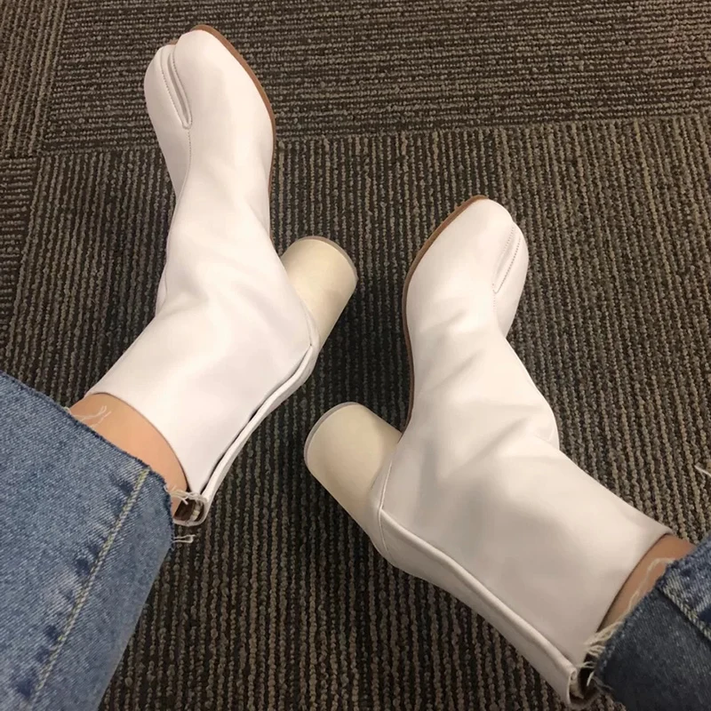 2024 marca de luxo design couro tabi botas moda redonda grosso salto alto tornozelo botas para mulheres outono inverno sapatos dedo do pé dividido