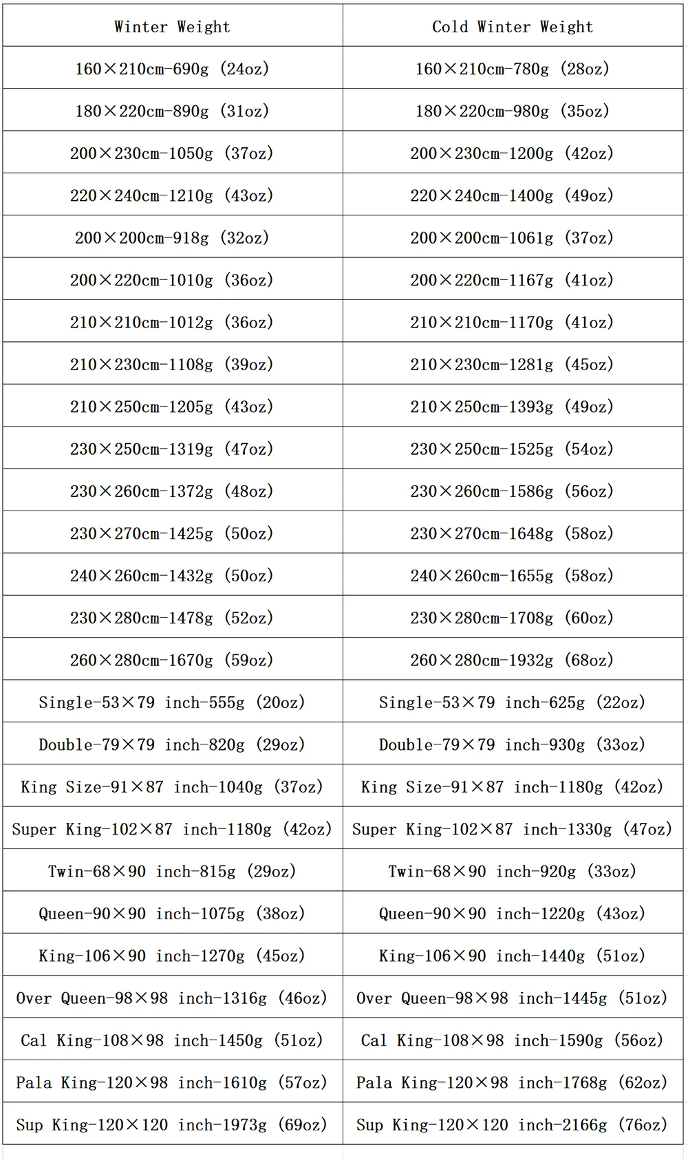 Os valores numéricos seguindo as dimensões referem-se ao peso do recheio de penugem de ganso, e não ao peso total.