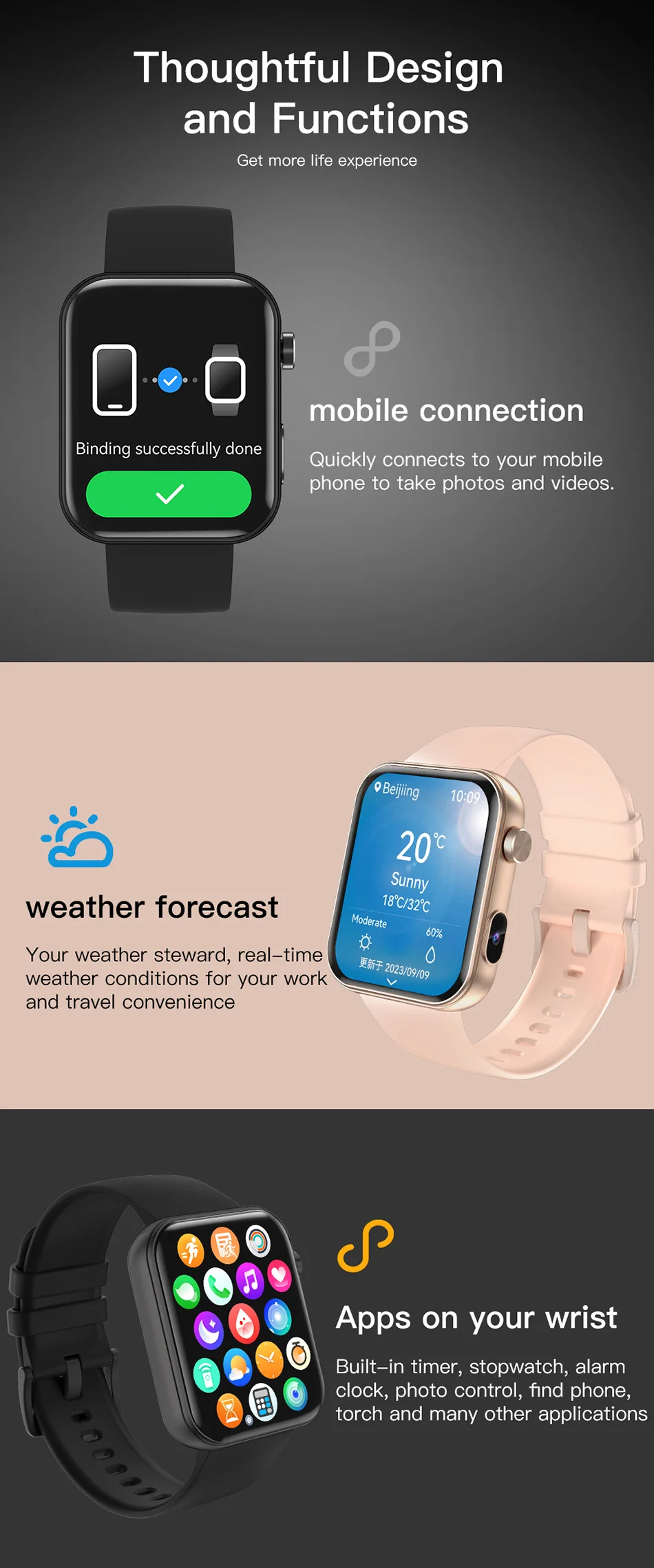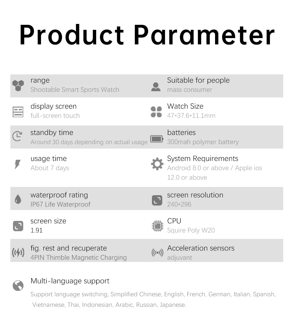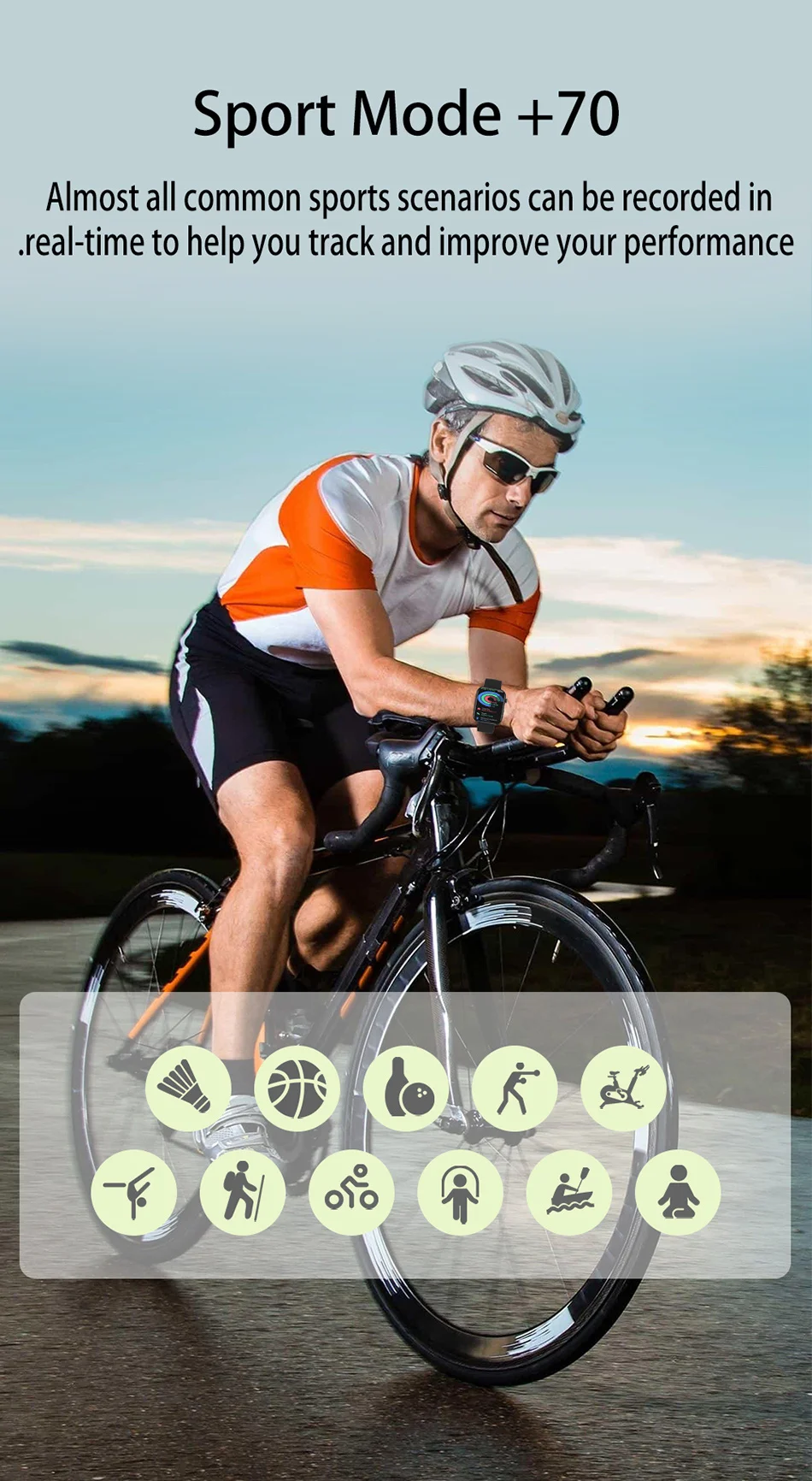 Chamadas Bluetooth, Câmera, Álbum, Gravação de som, Oxigênio no sangue, Frequência cardíaca, IP67 à prova d'água, Velocímetro / Calorias, Monitoramento do sono, Lembrete de despertador, Cronômetro, Construído em 8 + 12 tipos de esportes (12 tipos podem ser empurrados em segundo plano para substituir 80 tipos de esportes), lembrete sedentário, envio de chamada/SMS, notificação de mensagem, música de controle remoto, câmera de controle remoto, teclado de discagem, encontrar telefone, encontrar distância do motor,