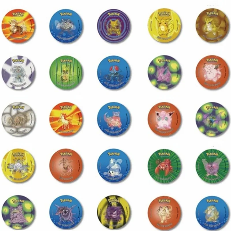 - > 27/56 pçs cartão de batalha das crianças uma variedade de gameplay coleção kawaii pikachu flash 3d cartão redondo inicial pokemon tazos