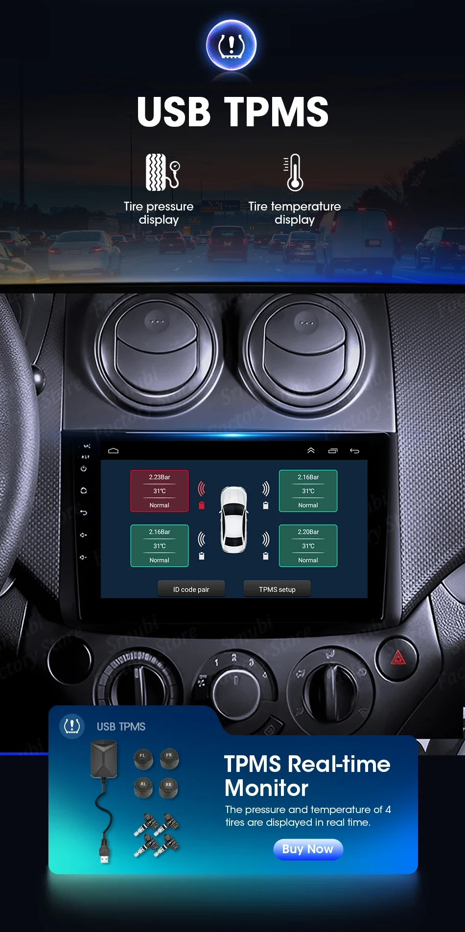 Suporta USB TPMS, feedback em tempo real do status dos pneus, cada vez mais padrões nacionais de fabricação de automóveis exigem que os veículos sejam equipados com dispositivos de alarme de pressão dos pneus.A importância dos dispositivos de alerta de pressão dos pneus é evidente.