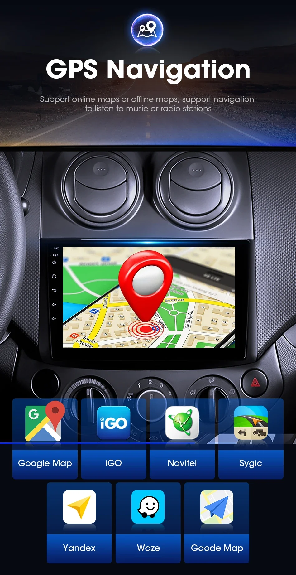 Suporta quase todos os aplicativos de mapas.O software de mapa off-line IGO é instalado por padrão e os arquivos do mapa serão atualizados regularmente.