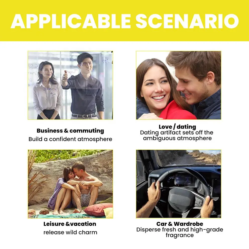 Aplique óleo essencial natural corporal de feromônio no pescoço, orelhas, pulsos, peito ou outras partes do corpo para liberar feromônios suficientes para torná-lo particularmente atraente.