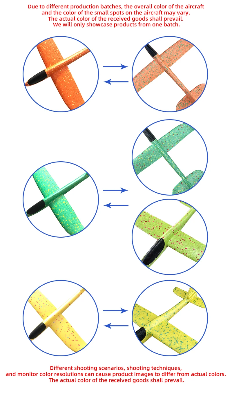 2:Due to different production batches, the overall color of the aircraft and the color of the small spots on the aircraft may vary. The actual color of the received goods shall prevail. We will only showcase products from one batch.