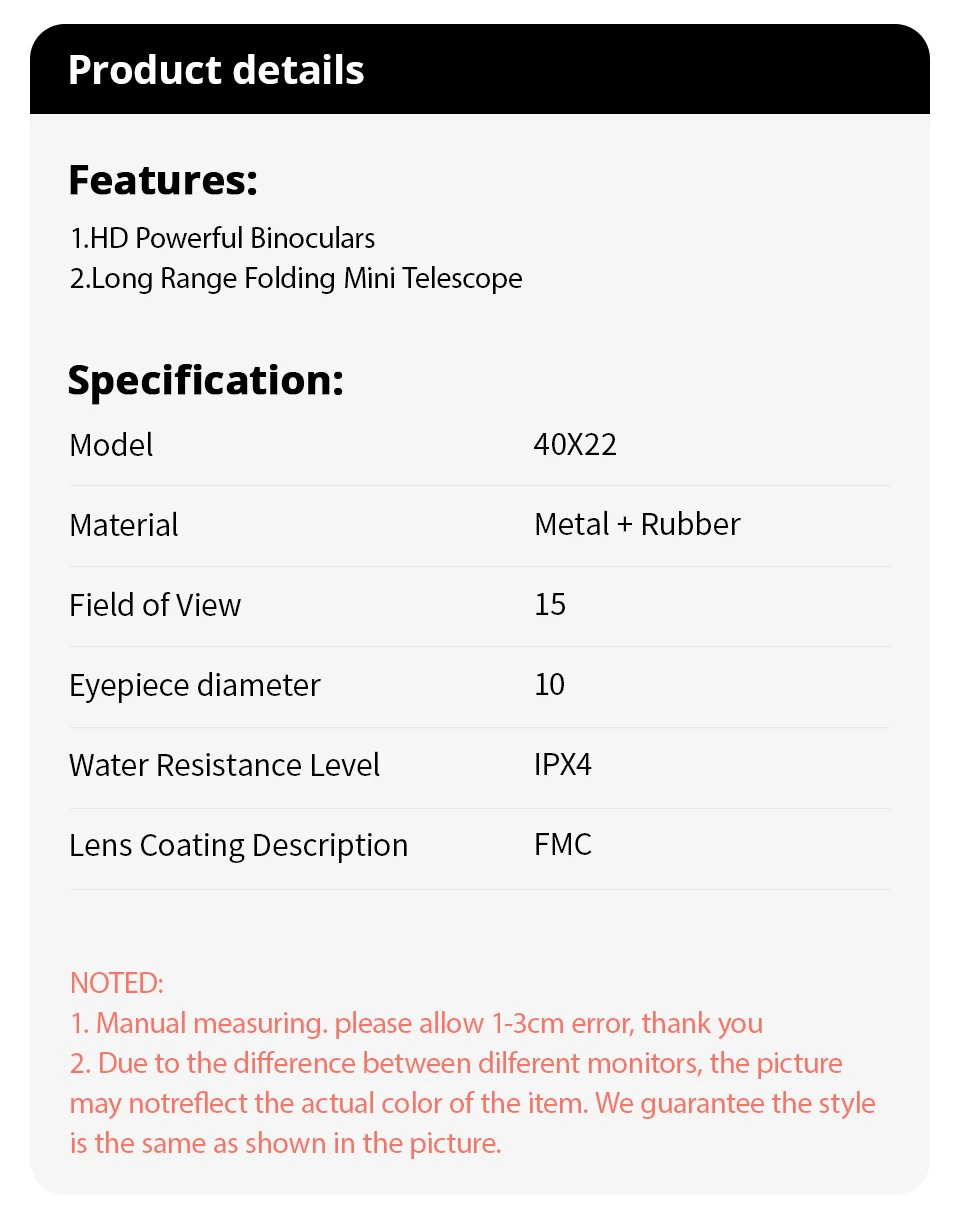 • Compacto e portátil:O design dobrável desses binóculos os torna fáceis de transportar, perfeitos para atividades ao ar livre como caça, camping e viagens.