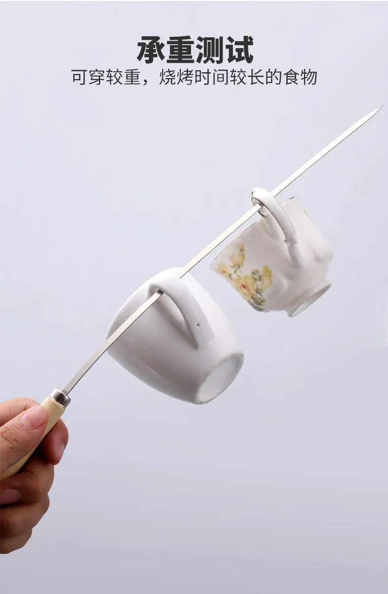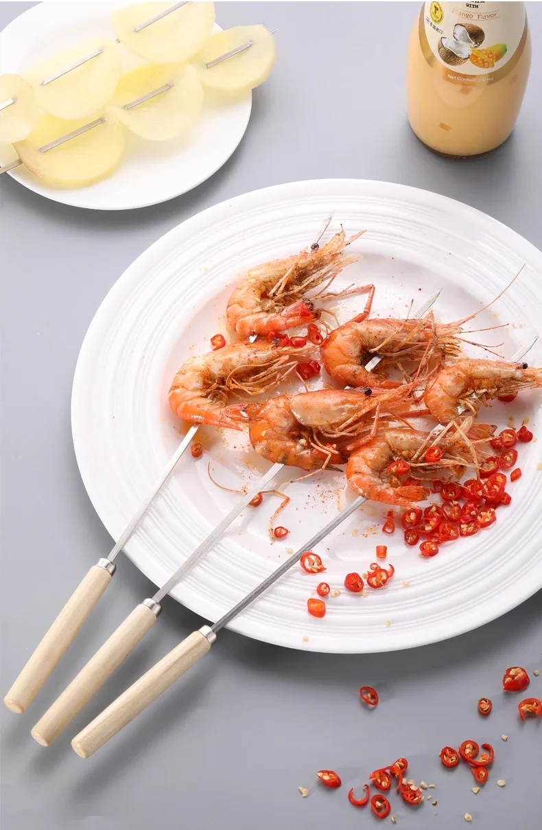 5/10 peças espetos de churrasco anti-escaldante com cabo de madeira podem ser reutilizados 304 espetos de churrasco de metal de aço inoxidável espetos largos