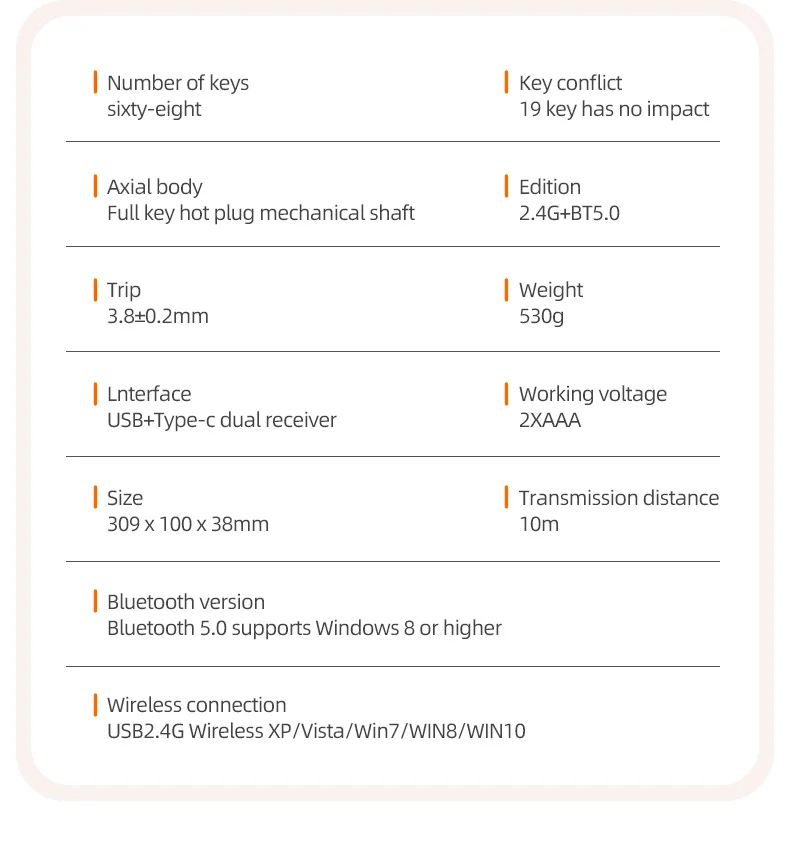 Este mini teclado para jogos K68 60% adota um layout ultracompacto de 68 teclas, com teclas de seta independentes, mais adequado para jogadores e digitadores, dando mais espaço à sua área de trabalho.O teclado para jogos Bluetooth sem teclado numérico tem um design ergonômico de alta pressão, que não é fácil de cansar após uso prolongado.