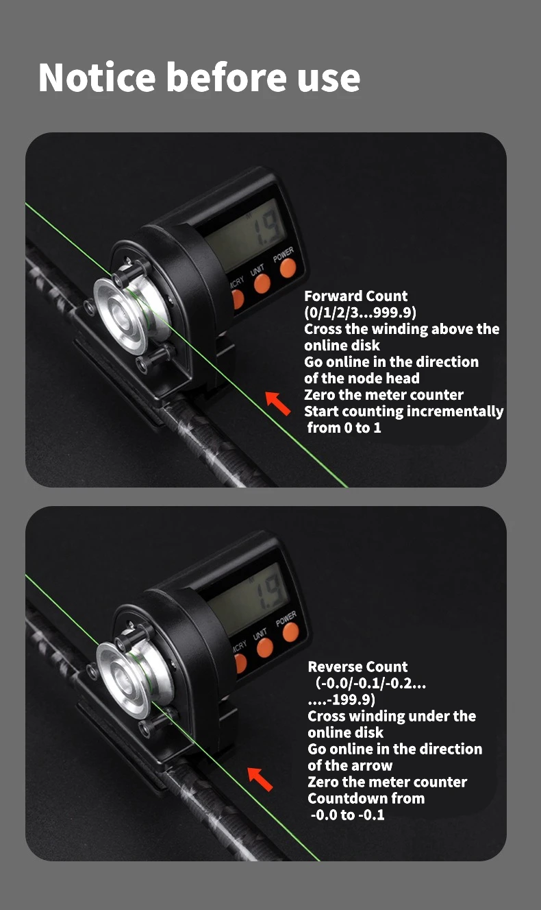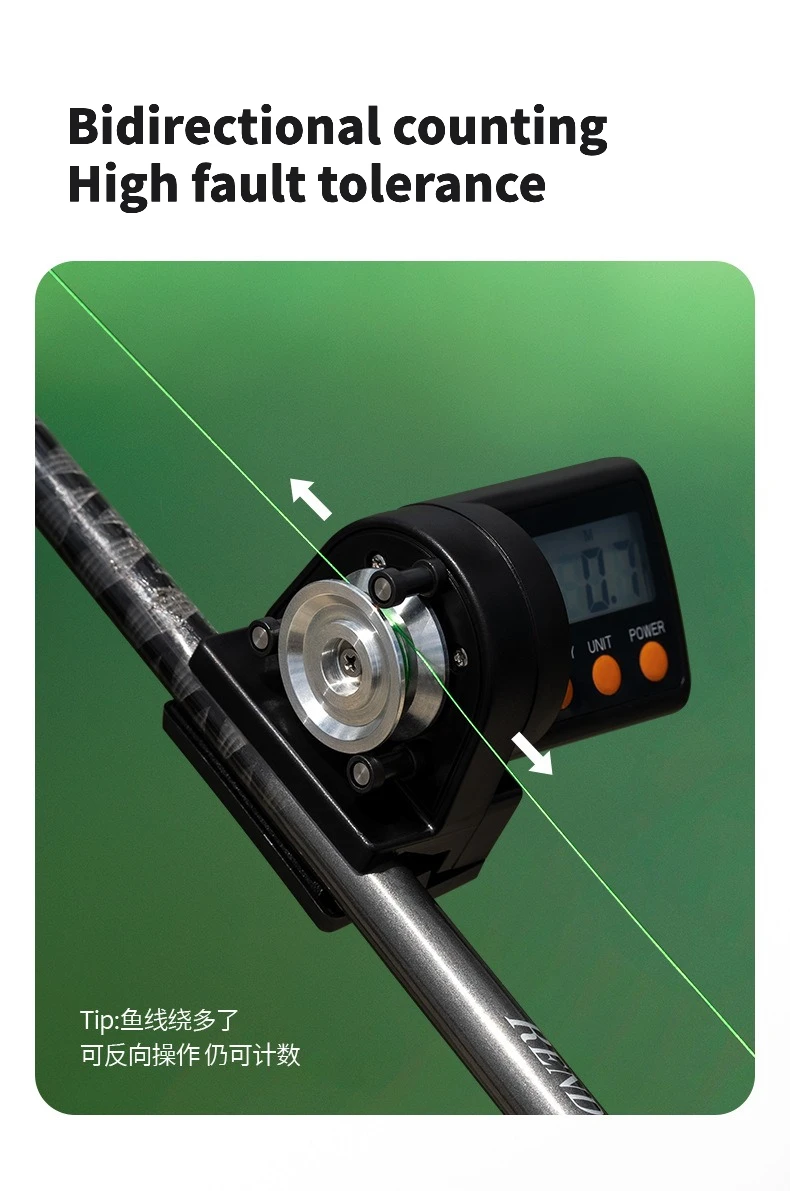 4.Mantendo medição bidirecional, com alcance de -199,9 metros a 999,9 metros, pode medir com precisão o comprimento da linha de pesca liberada e retraída, com alta tolerância a falhas.A linha de pesca pode ser operada ao contrário por várias curvas e ainda contando.