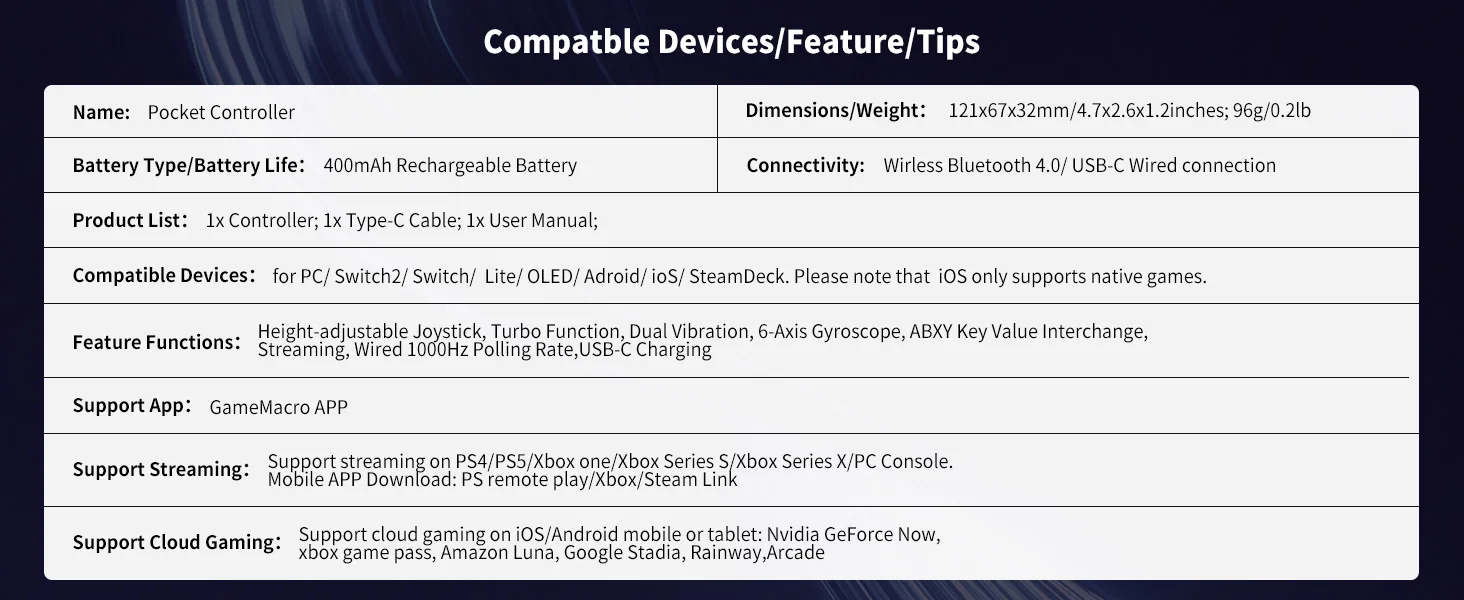 Controlador de bolso sem fio AceGamer compatível com Switch/Switch2/ Lite/ OLED/PC/ iOS/ Android/ Steamdeck/ GameMacro APP.Suporte para streaming, jogos em nuvem.