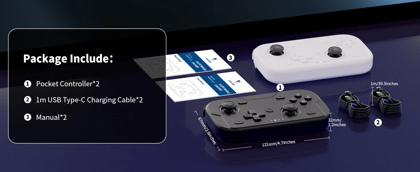Você pode obter: 2x Controlador de Bolso Sem Fio Bluetooth; 2x Cabo de Carregamento; 2x Manual do Usuário; Serviço pós-venda profissional. Nós nos concentramos no design, produção e vendas de controladores personalizados. Se você tiver alguma dúvida, entre em contato conosco a qualquer momento!
