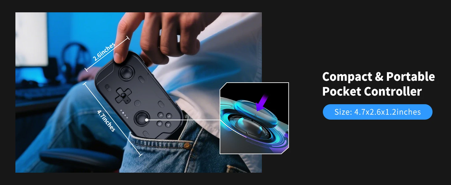 Com tamanho de 4,7"x2,6"x1,2" e peso de 3,3 onças.O design de elevação e redução do joystick torna o controlador mais portátil, não se preocupe com danos ao joystick.ele pode ser levado para qualquer lugar e jogado a qualquer momento.