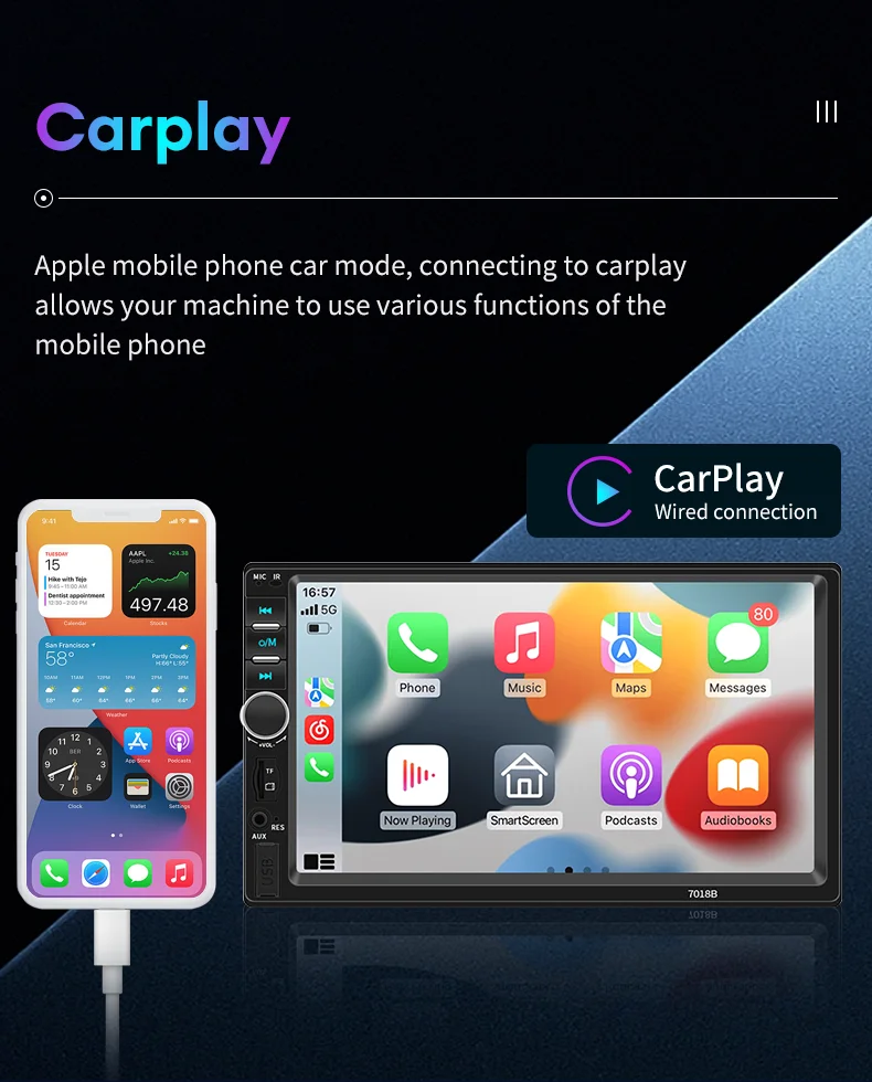 Acodo-Wired Carplay Stereo com Tela Sensível ao Toque, Multimídia Automotiva, Bluetooth, USB, TF, Rádio FM, Autoradio CarMP5 Player, 7in, 2Din
