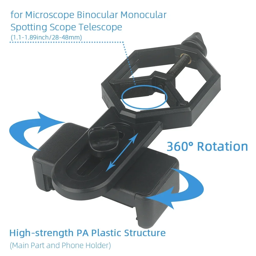 - > Adaptador de telefone celular de plástico para microscópio monocular, telescópio, binóculos, luneta, suporte de clipe para celular