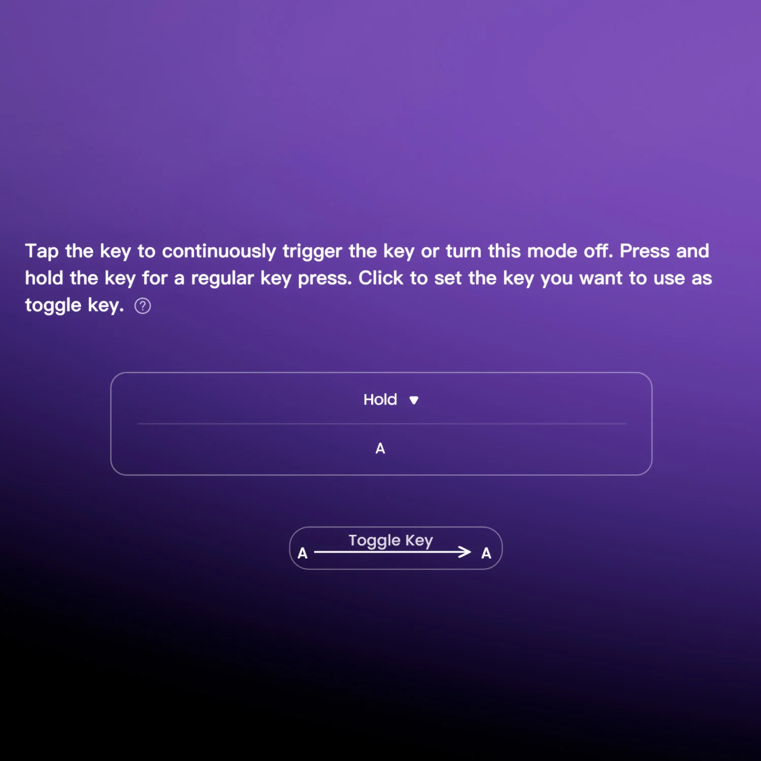 uma chave Mod-Tap Mod Tap em Shine60 é um design que oferece conveniência para jogos.Isso permite a criação de dedicados ou teclas duplas funcionais.Um único toque de tecla pode atingir duas funções: segurando desça a tecla para uma função e pressione a tecla para outra. | Tecidas dinâmicas Pressionando uma tecla na série Shine60 HE pode acionar quatro operações principais diferentes.Dependendo da força da sua tecla: um pressione leve aciona a ação 1, uma pressão mais profunda pressionar ativa a ação 2 e liberando a chave também suporta uma chave de dois estágios configuração. | Chave de alternância (TGL) TGL transforma uma chave em uma alternância interruptor.Ao pressionar este switch, você pode ativar um dos dois cenários: ou mantenha continuamente pressionado o chave/função, ou acionar a chave/ funcionar várias vezes em alta frequência. |