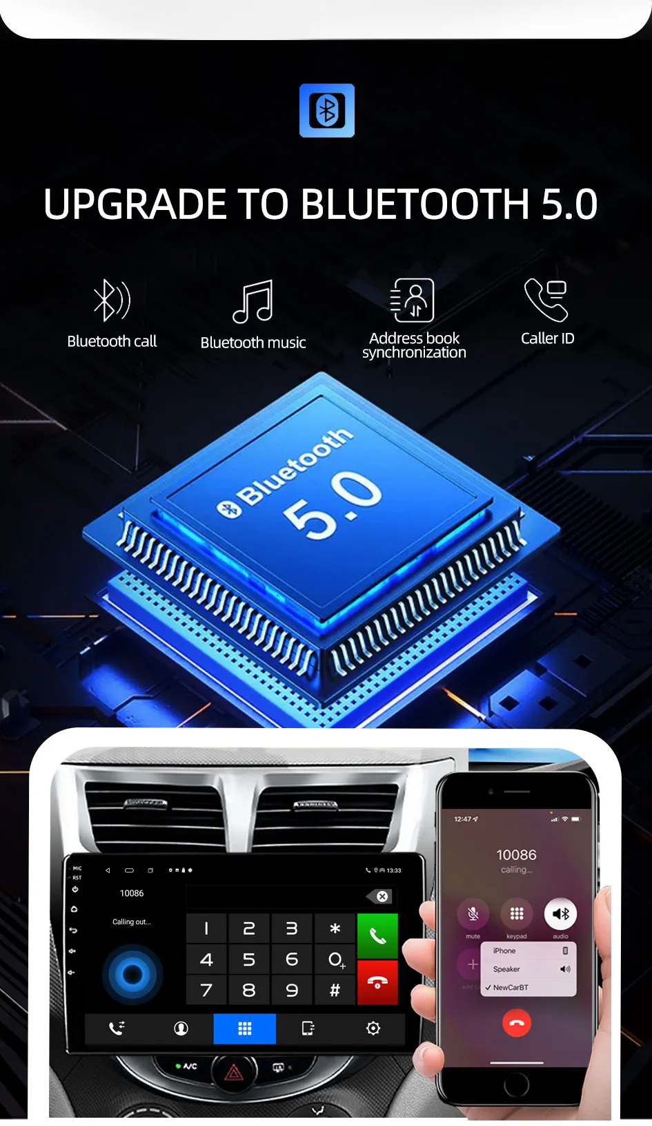 Built-in bluetooth 5.0, support bluetooth phone, bluetooth music, address book.