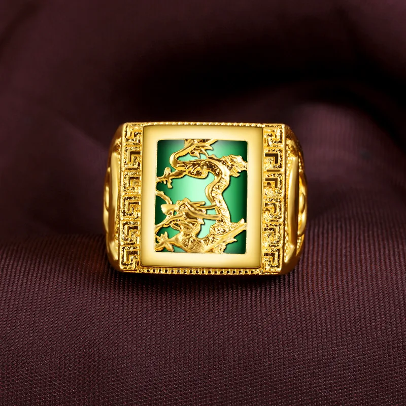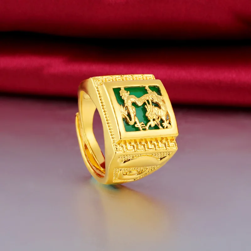 - > Anel do zodíaco do dragão masculino em ouro 24K AU999 - Dragão polido + contraste do zodíaco fosco, nuvens cinzeladas-flamas, negociação aura completa