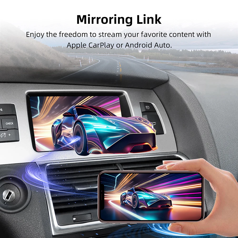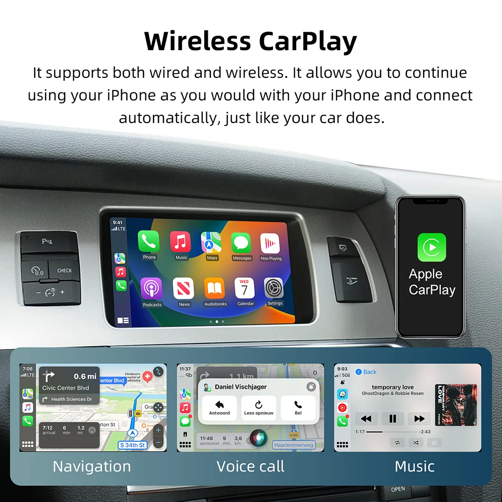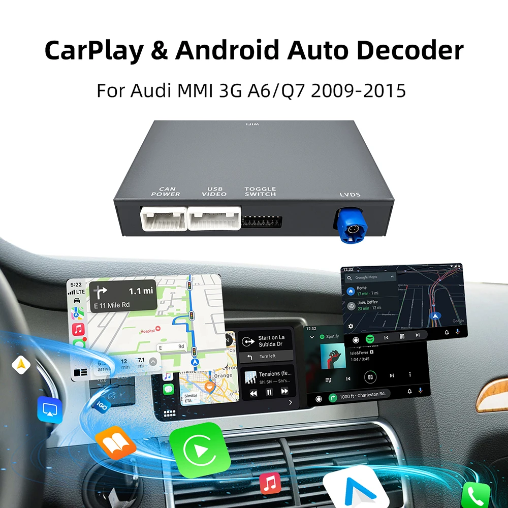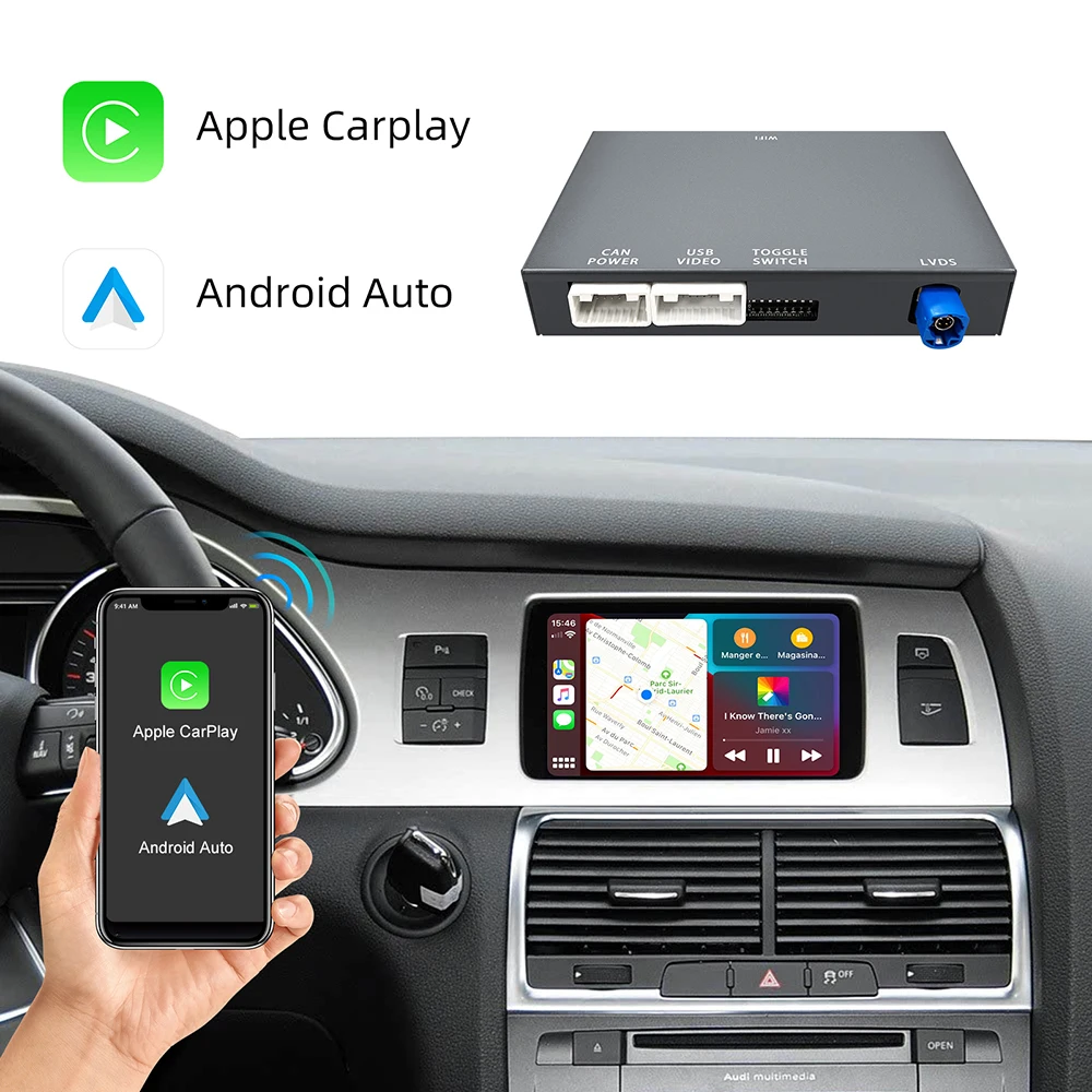 A caixa decodificadora AUDI é um kit CarPlay e Android Auto que adiciona a funcionalidade CarPlay e Android Auto a um veículo padrão.O kit dá uma sensação e aparência “OEM”, pois mantém a exibição existente no painel, bem como os controles MMI 3G (controlador rotativo e controles do volante)