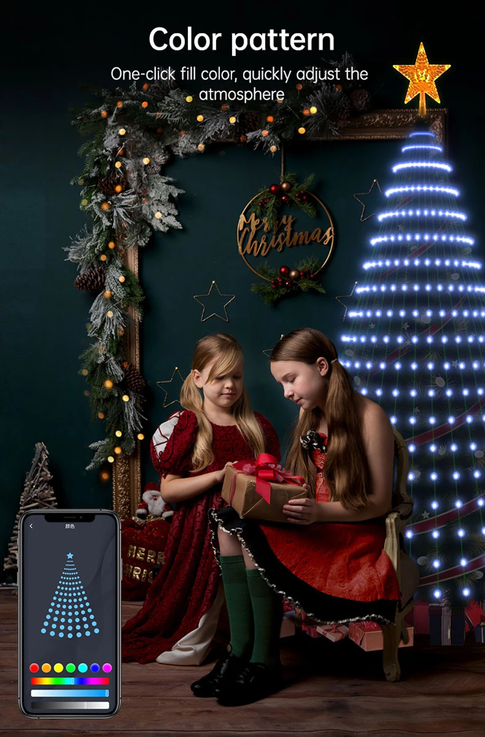 Árvore de natal inteligente toppers luzes app diy imagem led rgb luz da corda controle bluetooth led estrela corda cachoeira natal