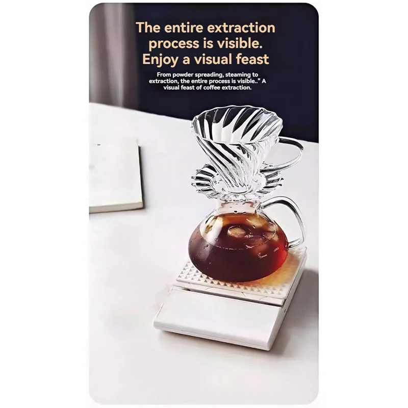 Extração ideal com gotejador de vidro em forma de V: Feito de vidro borossilicato transparente e sem chumbo, o gotejador de café em forma de V aumenta a extração do sabor.As ranhuras guia em espiral dentro do gotejador otimizam o contato entre os grãos de café e a água, levando a uma bebida mais rica e aromática.
