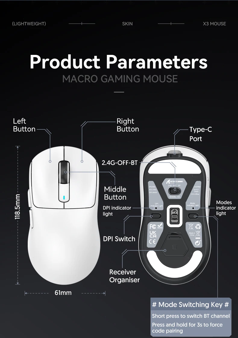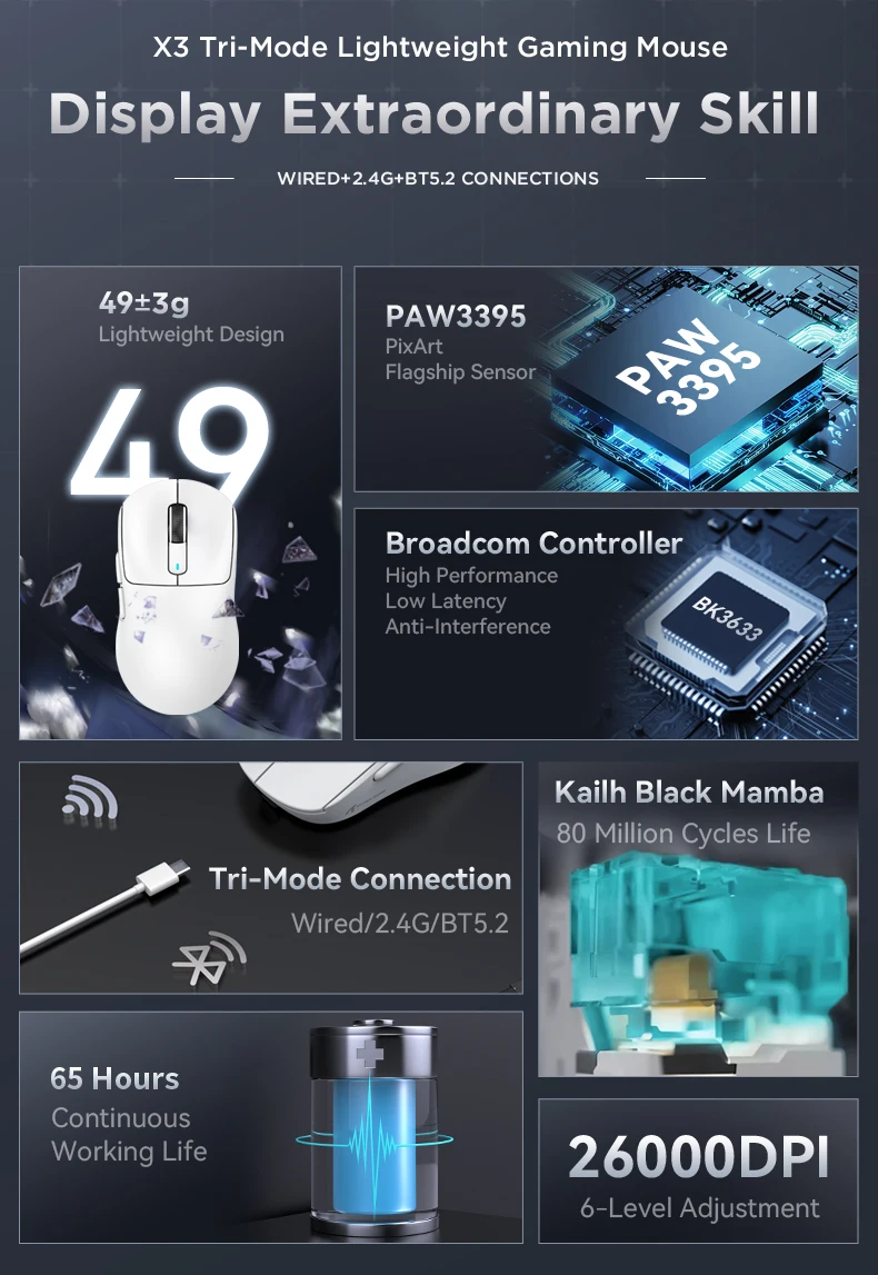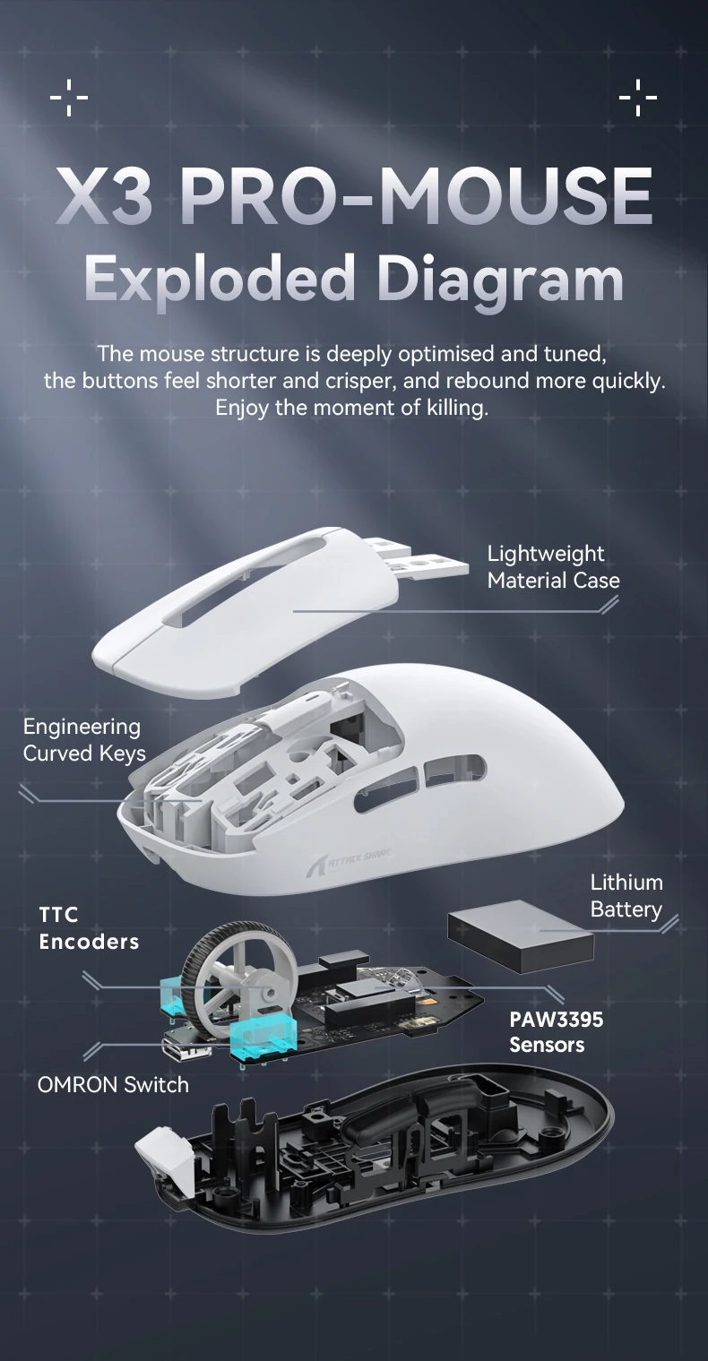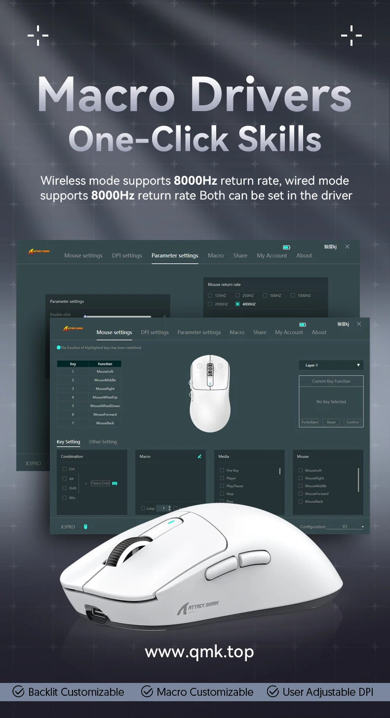 - > Attack Shark X3orX3Pro PixArt 1K/4K leve, mouse para jogos macro sem fio de 3 modos, 26K DPI PAW3395, adequado para laptop/Win/Mac