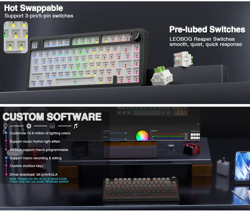 Experimente sessões de jogo vibrantes com a iluminação RGB personalizável do AULA F75, oferecendo infinitas opções de cores para personalizar sua configuração.