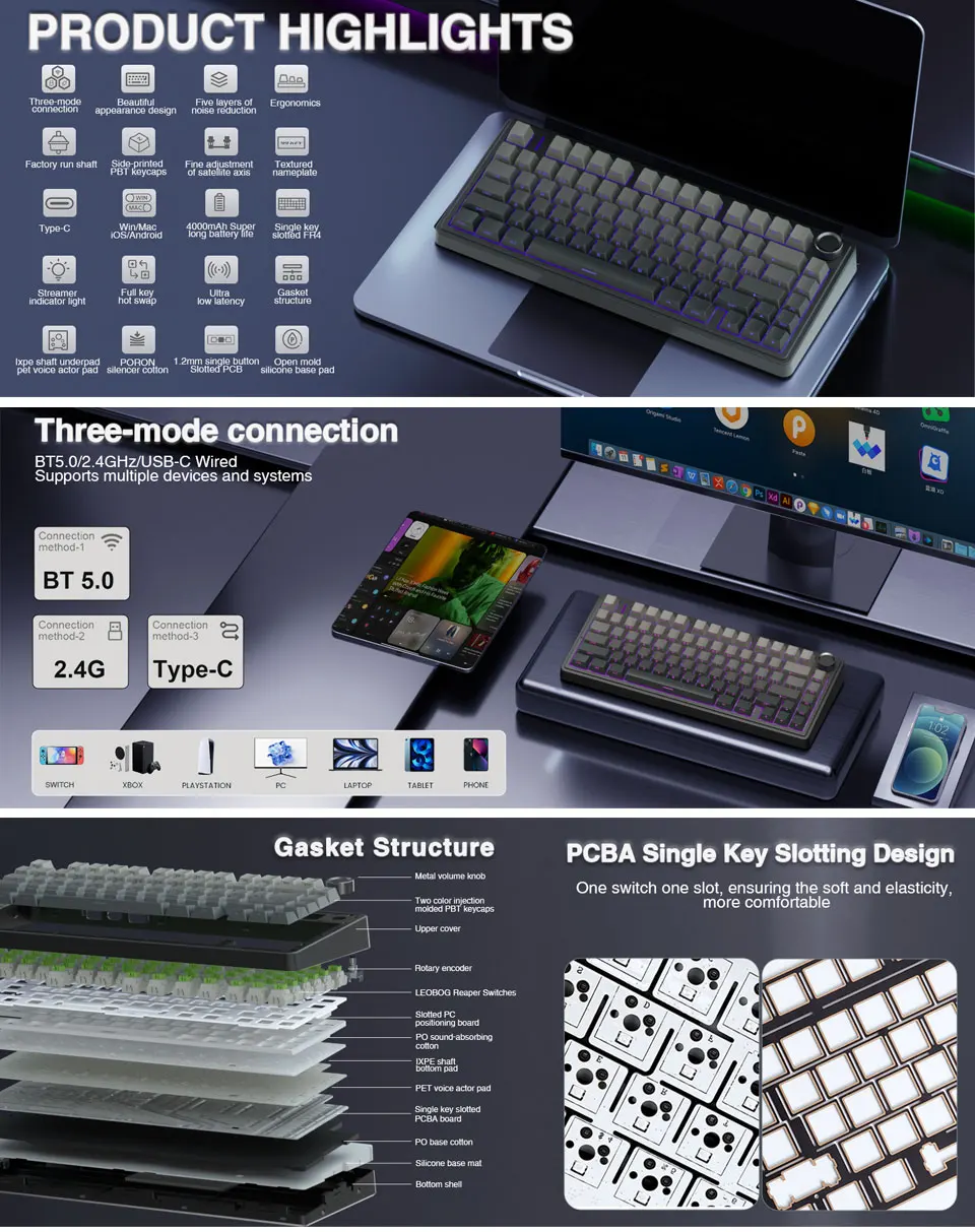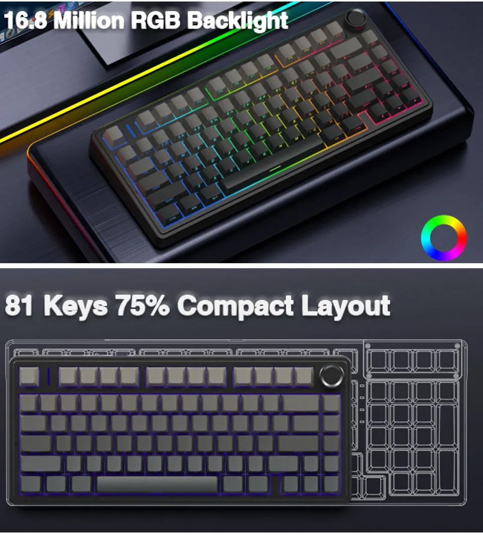 - > AULA F75 Teclado Mecânico para Jogos RGB Personalizado 75% Layout Junta de Gravação Lateral Montado 80 Teclas PBT Gradiente Teclado