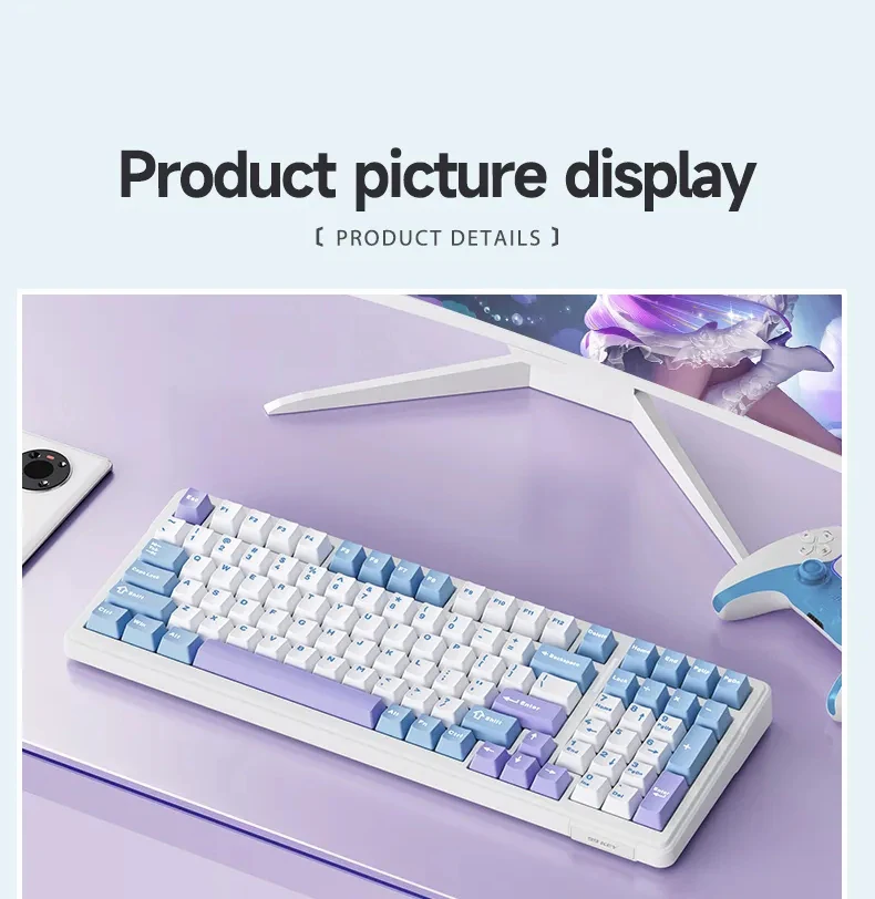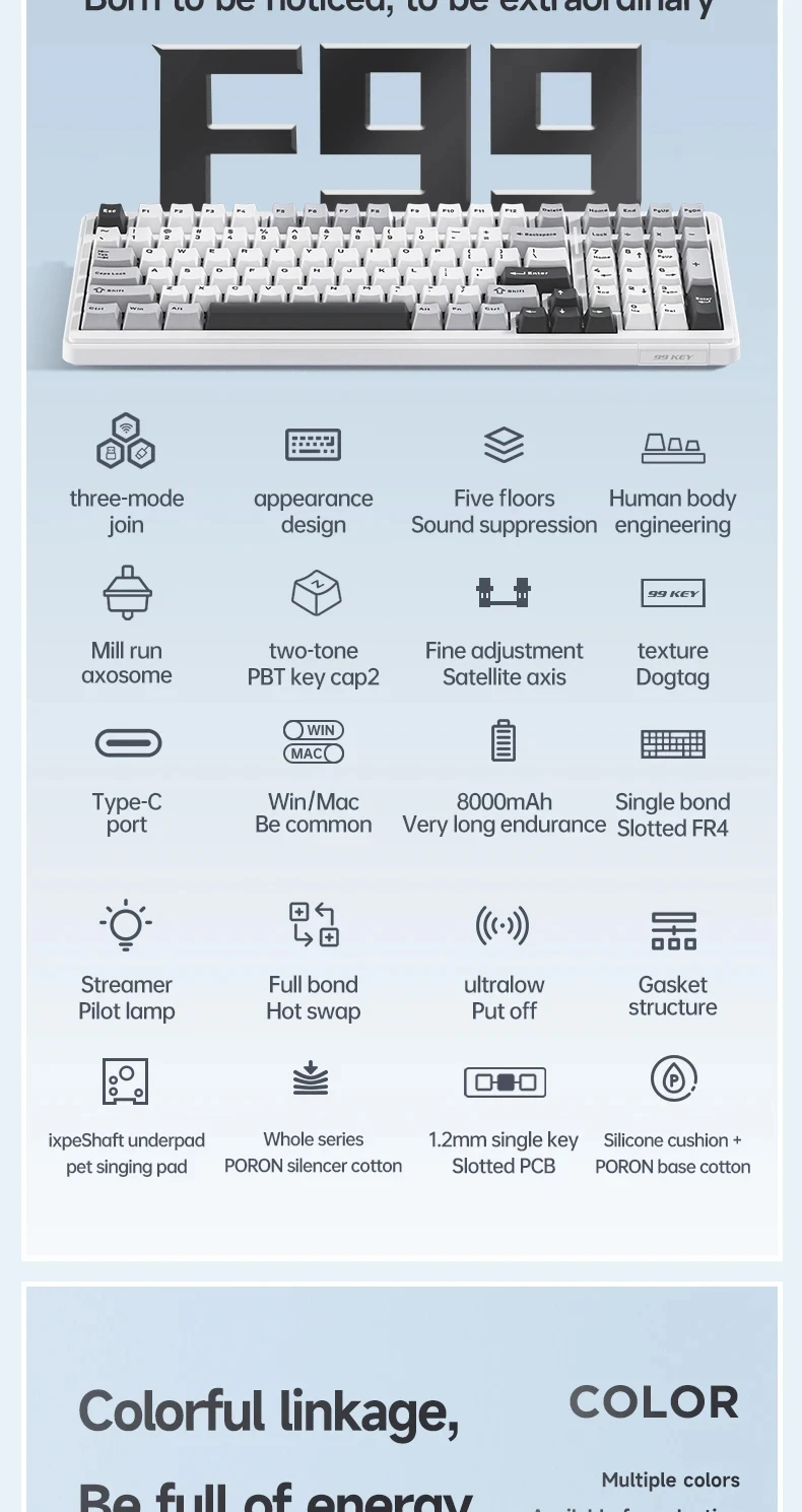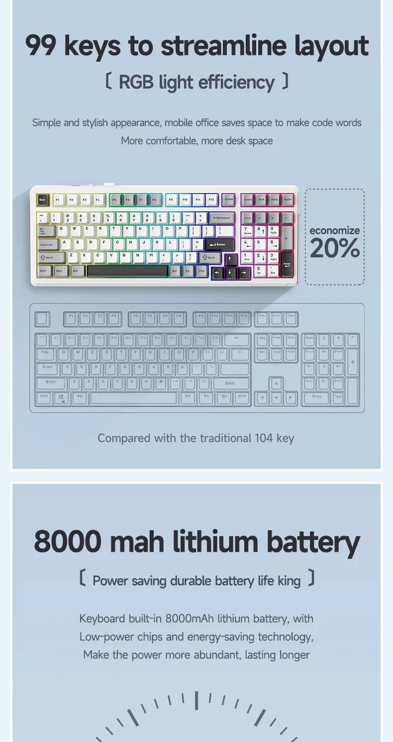- Connection: Type-C wired & 2.4G wireless & Bluetooth- Keys: 99 keys- Hot swappable:3-pin/5-pin Hot-swap- Backlight: RGB Back Light- Profile: Cherry profile- Product size:390.63 x 146.78 ×42.57mm- Product weight: Approx.1132g (without cable/receivery/Approx.1183g (with cable/receiver)- Rated Voltage:DC 3.7V(Full 4.2V)- Capacity:8000mAh(2*4000mAh) rechargeable Li-ion Battery- Charging Voltage/Current:DC 5V/= 830mA- Rated current: 150mA @3.7V (default light effect)/20 mA(off all lights)- Endurance:Approx.53 hours (default light effect)/Approx.400 hours (all lights off)- Operating system: WIN XP/7/8/10/Android/IOS/MAC- with softwareGasket Structure with 5-layer noise reduction