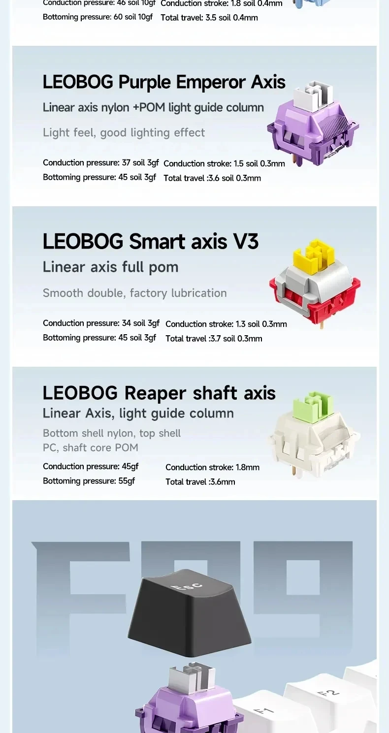 Shaft Material: POMShaft Type:Linear ShaftTotal stroke:3.7±0.3mmInitial pressure:28 gf MinConduction stroke:1.3±0.3mmConduction pressure:34±3gfBottom pressure:45±3gfMechanical life: approx. 60 million cycles