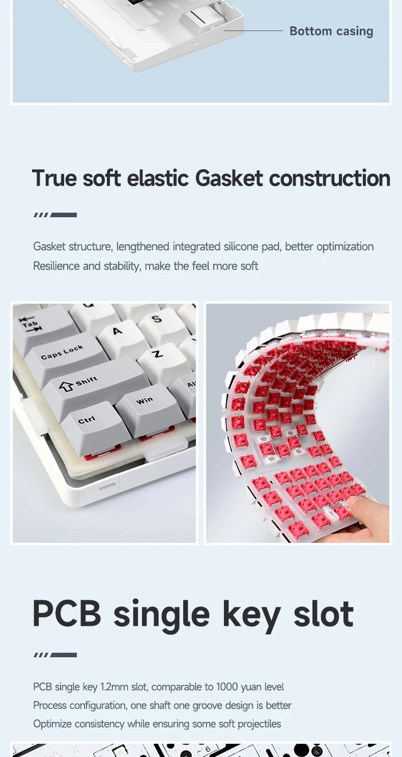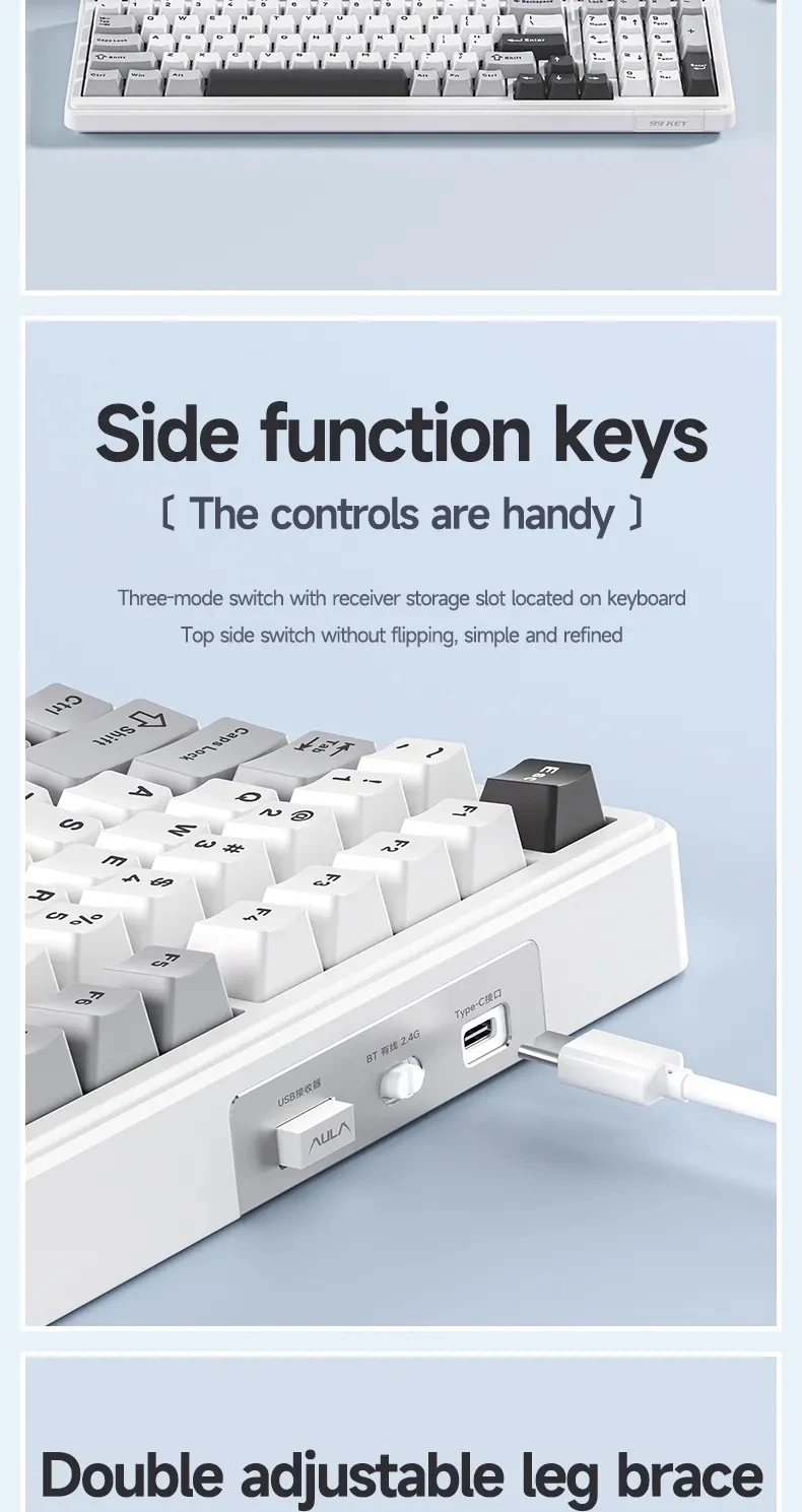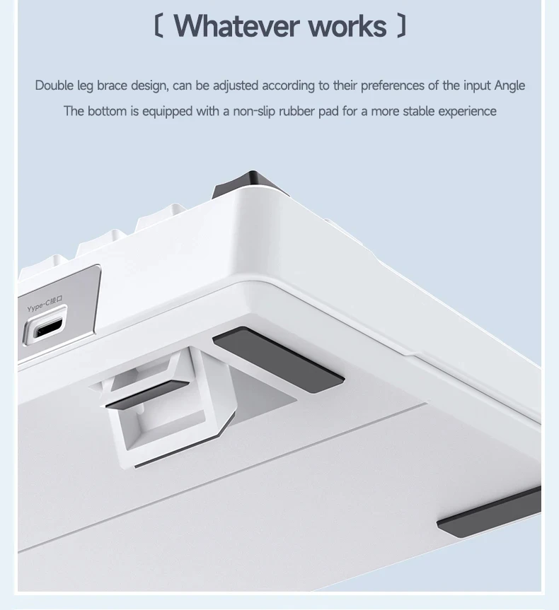 Side features designed for easy switchingThe three-mode switching and receiver storage slot are located above the keyboard. Side switching does not require flipping.which is simple and elegant.Height adjustable, to perfectly fit your comfort.With two-stage adjustable foot support design,you can autonomously adjust the bottom with non-slip rubber pads at the bottom of theinput angle of your preference, bringing a more stable use experience.