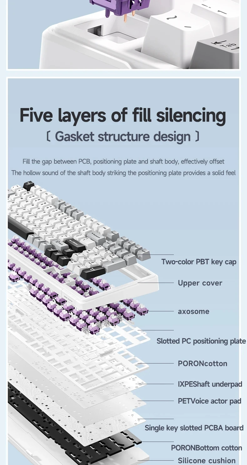 F99 is a high-end gasket-mounted keyboard with a PC plate. The keyboard also has a 5-layers premium silicone pads and noise reduction cotton to reduce 95% hollow noise,abosord typing noise,and enhance the unique soft and comfortable rebound of the Gasket structure.