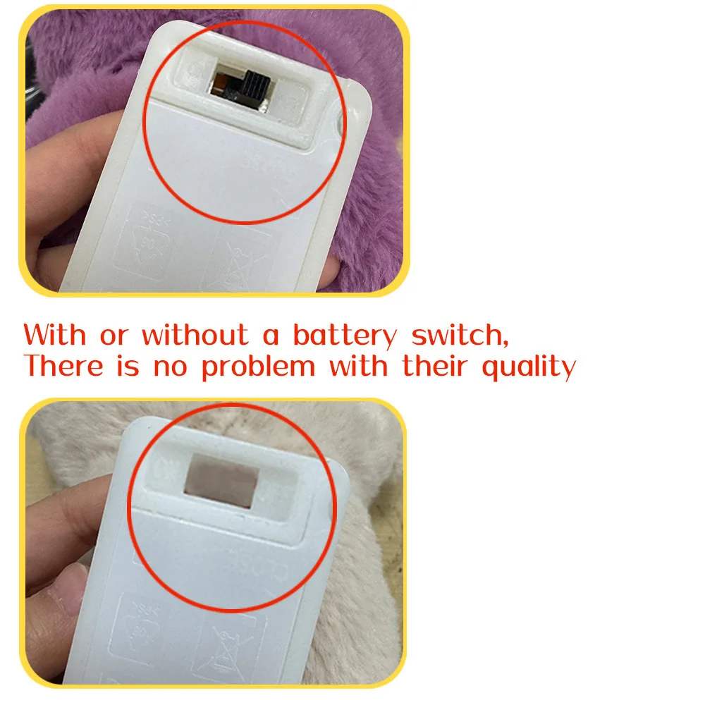Nota: Se o brinquedo não funcionar normalmente, você pode ligar o interruptor e dar um toque suave no estômago do brinquedo, e ele funcionará normalmente.