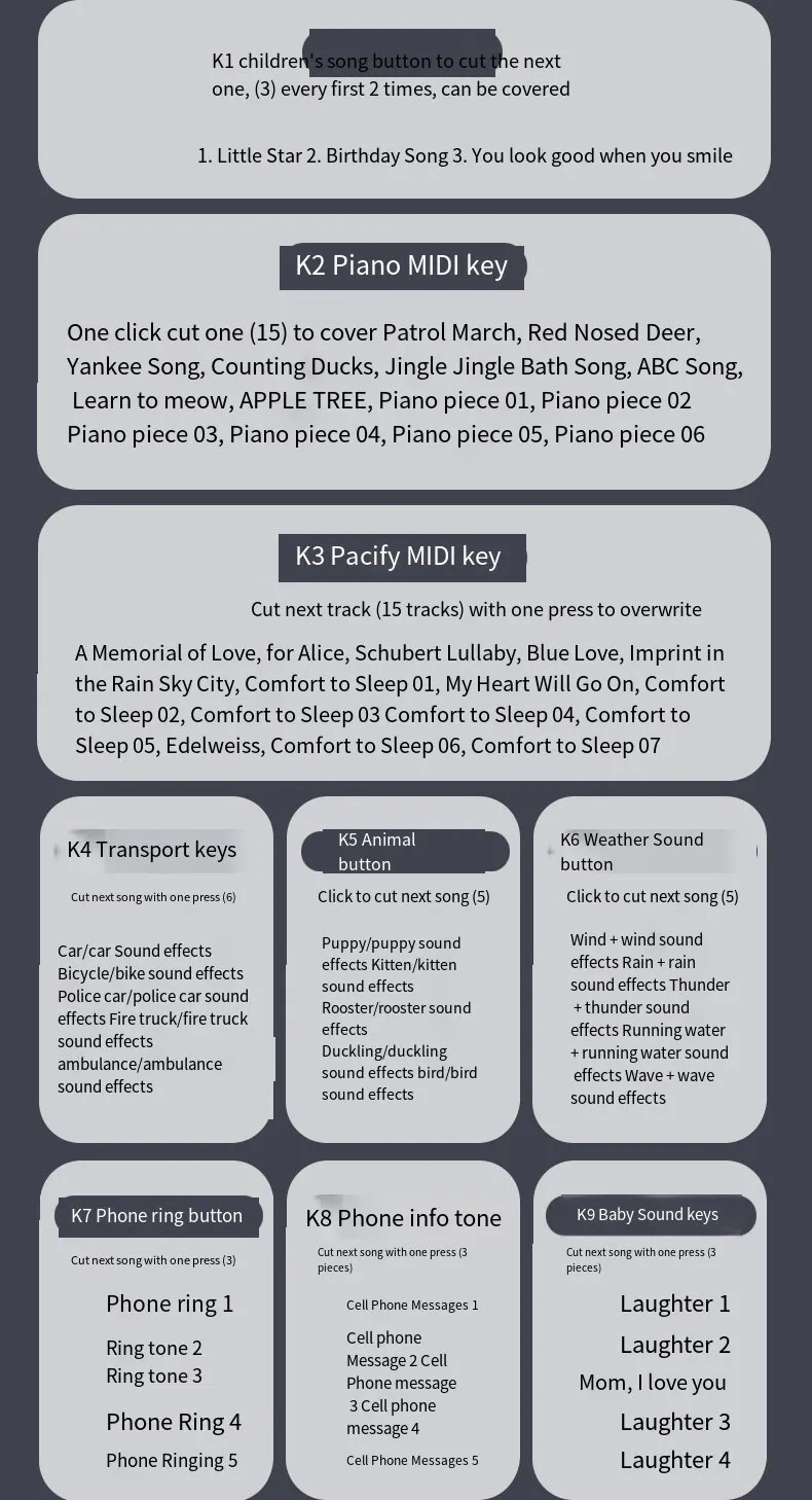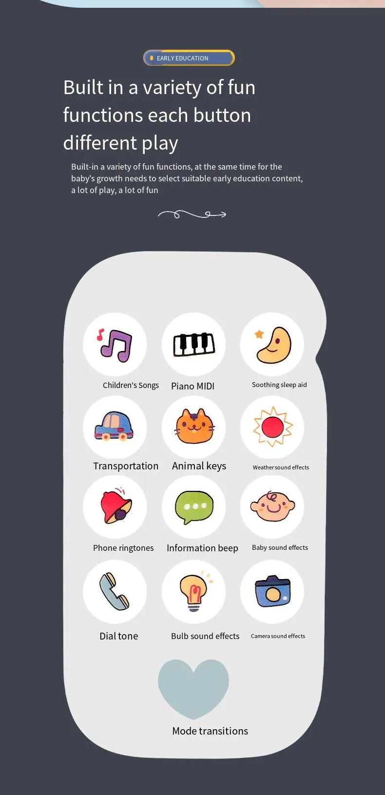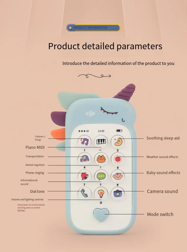 • Brinquedo educativo precoce:Este telefone de brinquedo é projetado para ajudar as crianças a aprender sobre música e sons em uma idade precoce, tornando-se uma ótima ferramenta educacional para os pais.