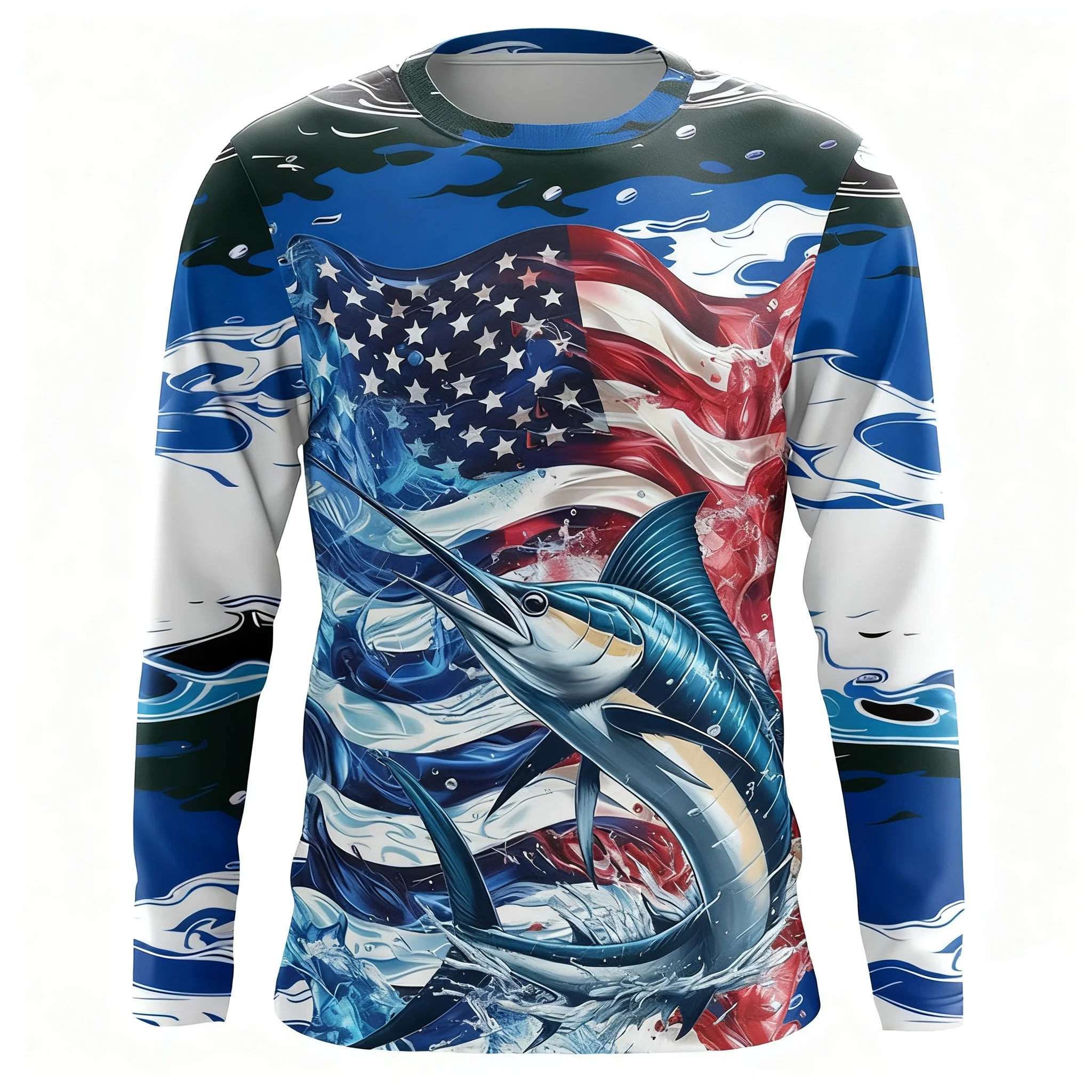 Bandeira americana crânio de pesca camiseta de manga comprida verão camisa de pesca pesca em torno do pescoço de manga comprida solta de secagem rápida pullove