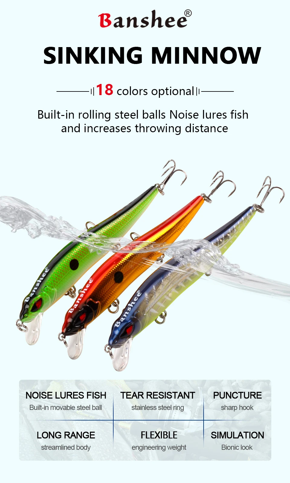 Banshee-Artificial Hard Bait Wobblers, Isca de Pesca para Pike, Poleiro, Truta, JERK, Minnow, Sinking, Qualidade, 18 Cores, 100mm, 10g