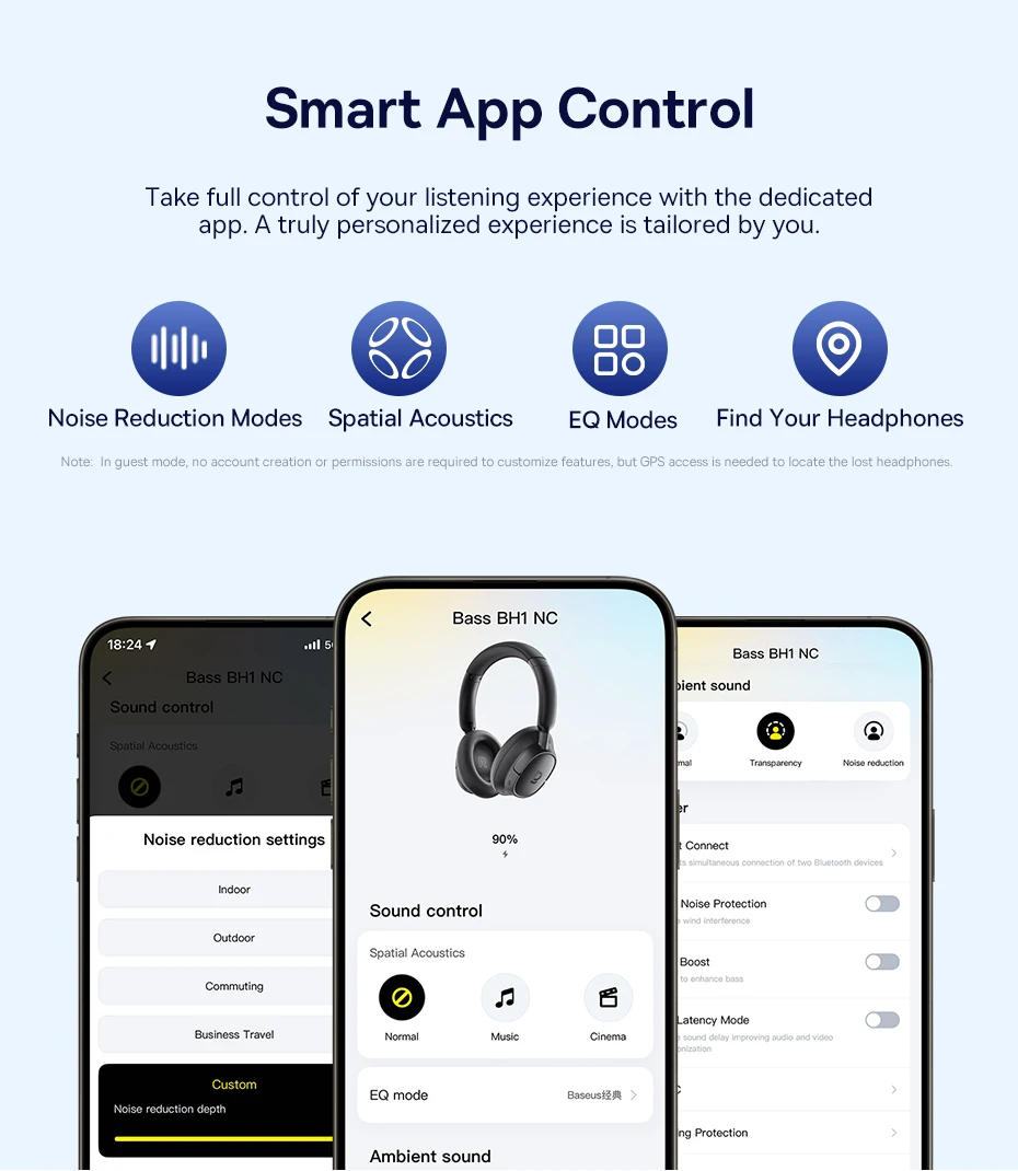 No modo convidado, nenhuma criação de conta ou permissões são necessárias para personalizar recursos, mas o acesso GPS é necessário para localizar fones de ouvido perdidos.