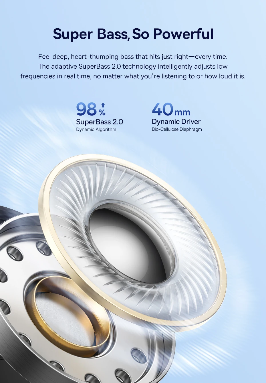 3.SuperBaixo 2.0: Sinta a batida com graves ricos e pontiagudos e clareza detalhada.Os fones de ouvido adaptativos com cancelamento de ruído usam SuperBass 2.0 para aprimorar dinamicamente as baixas frequências em tempo real, combinados com diafragmas de biocelulose e drivers dinâmicos para profundidade envolvente.