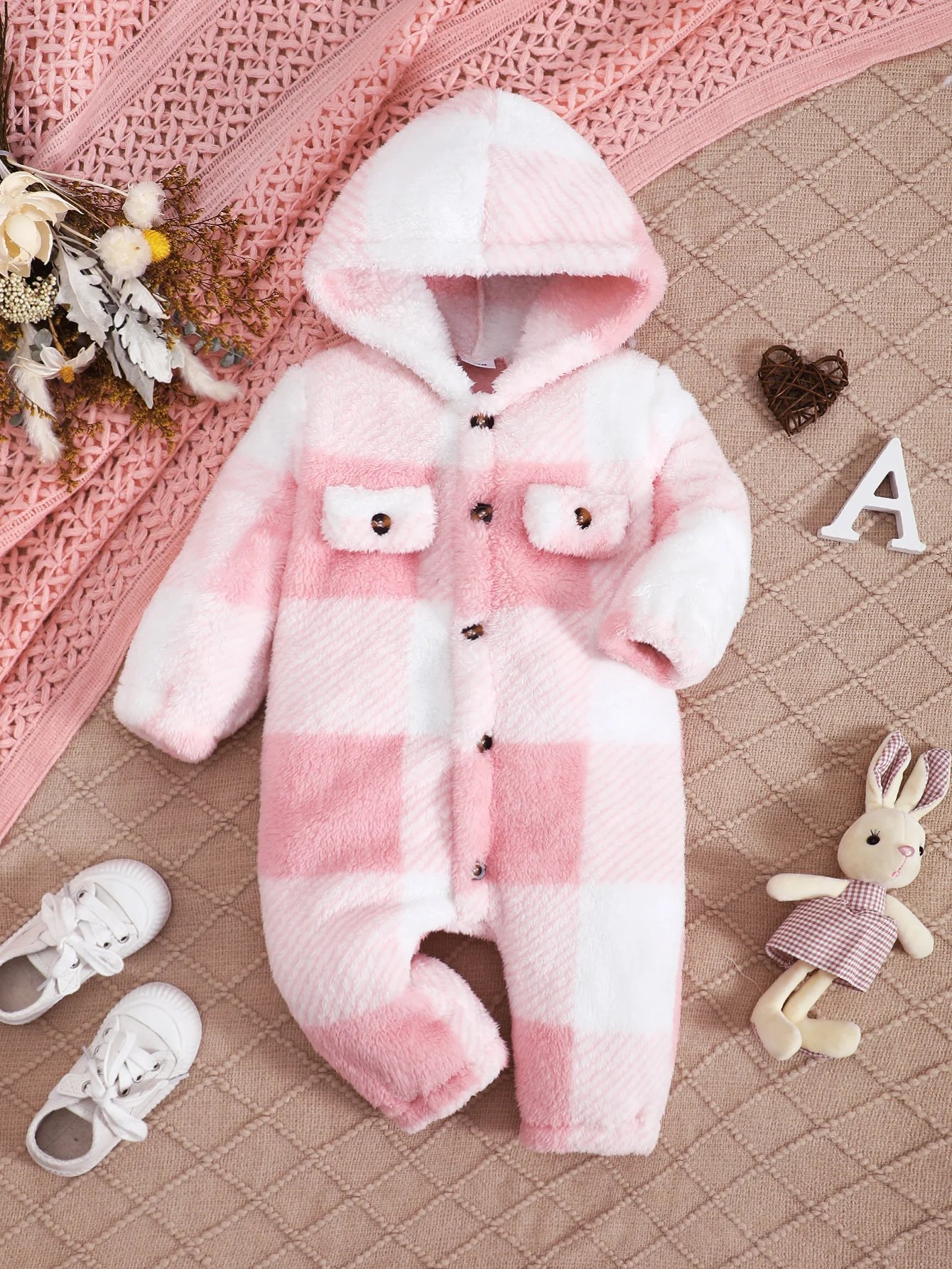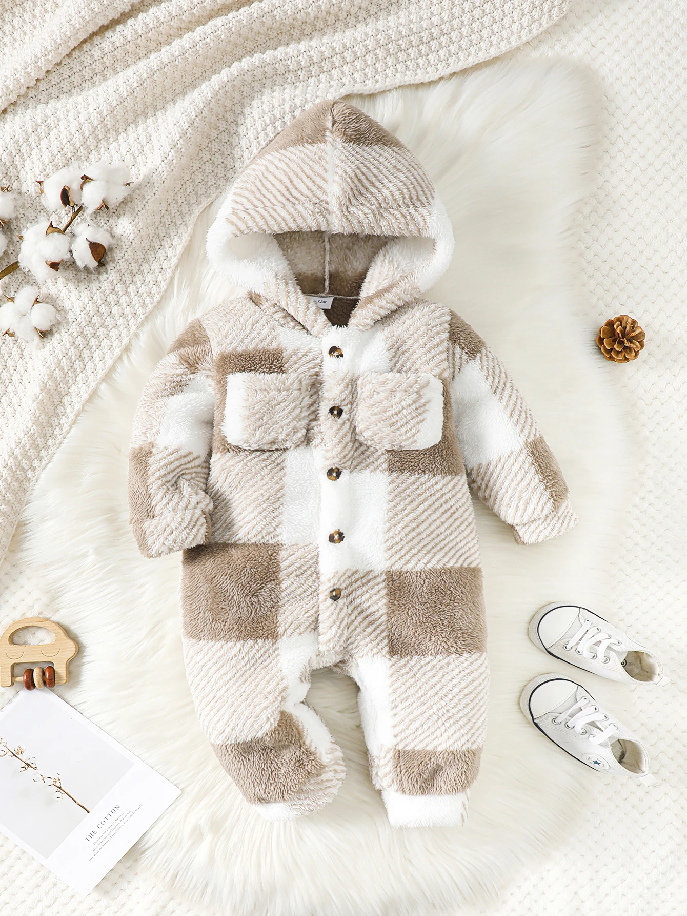 - > Bebê meninos e meninas xadrez macacão com capuz manga comprida macacão de pelúcia inverno quente bodysuit roupas para 3-24 meses criança menino