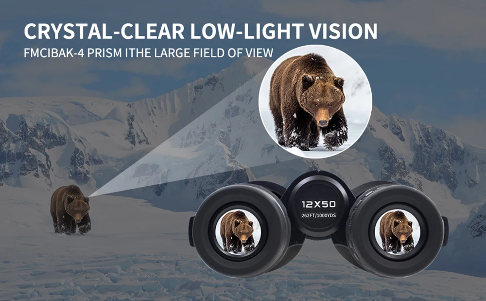 Binóculos transparentes de visão com pouca luz 12x50 - Equipados com uma lente objetiva de 50 mm com revestimento de filme vermelho (revestimento de filme vermelho - filtrando luz forte, melhorando a clareza e o brilho da imagem para mostrar mais detalhes, melhorando o contraste da imagem para apresentar uma sensação de tridimensionalidade) e alta -Vidro especializado de transmissão, esses binóculos oferecem o melhor desempenho possível em cenários de observação com pouca luz.Permite que você experimente uma dimensão totalmente nova de caça em condições de pouca luz.