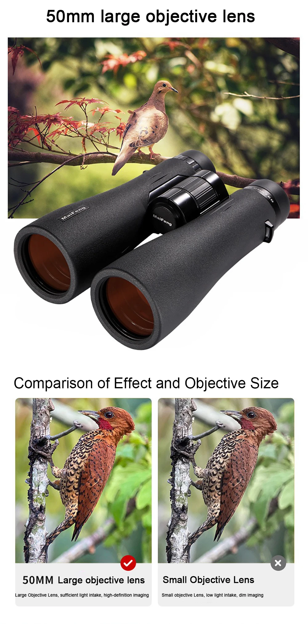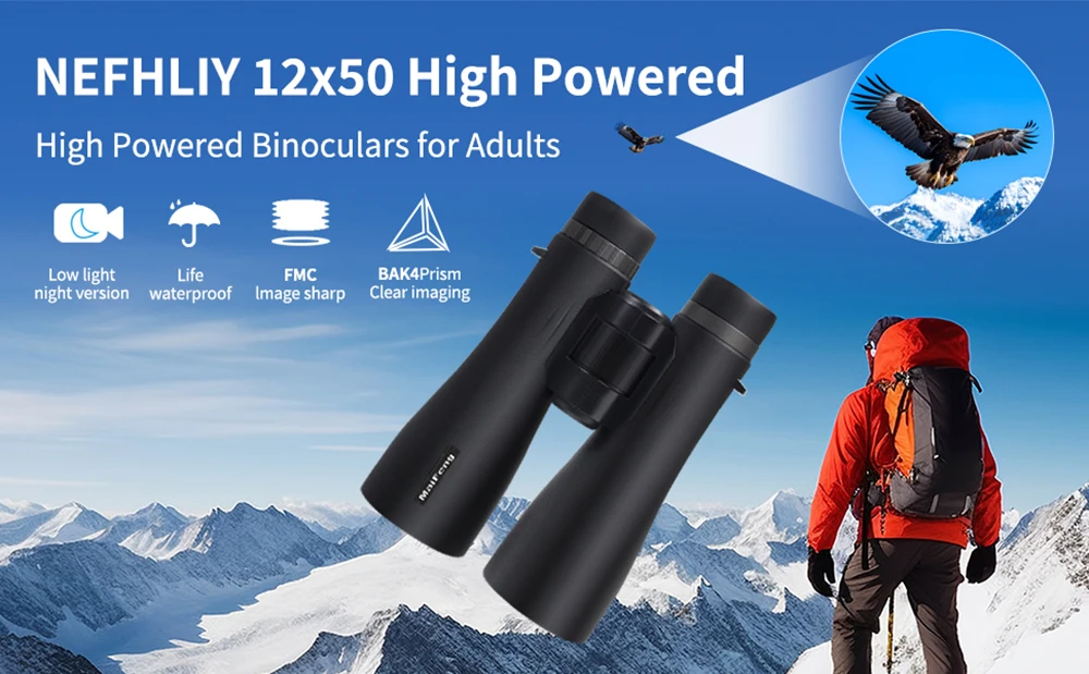 Binóculos PROFISSIONAIS HD BINOCULARS-Maifeng 12x50mm para adultos de alta potência com lentes totalmente multirrevestidas e prismas de revestimento dielétrico BaK4 de 22mm.Mesmo nas condições mais adversas e no ambiente mais desafiador, os binóculos Maifeng proporcionam brilho, clareza e nitidez excepcionalmente.