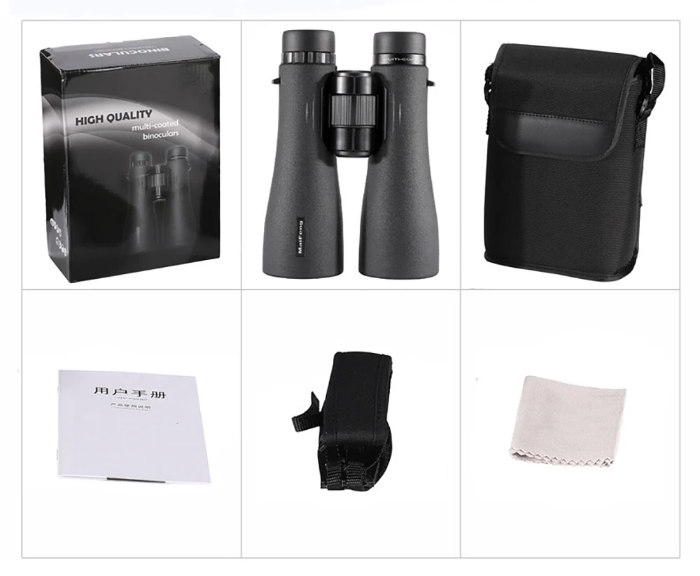 O QUE ESTÁ NO BOX-NEFHLIY Binóculos profissionais com garantia de qualidade. Este pacote abrangente inclui: binóculos 12x50, um adaptador de telefone atualizado, um pano de limpeza, uma bolsa de transporte, um manual do usuário, uma alça de pescoço, uma capa de ocular e duas capas de lente objetiva.