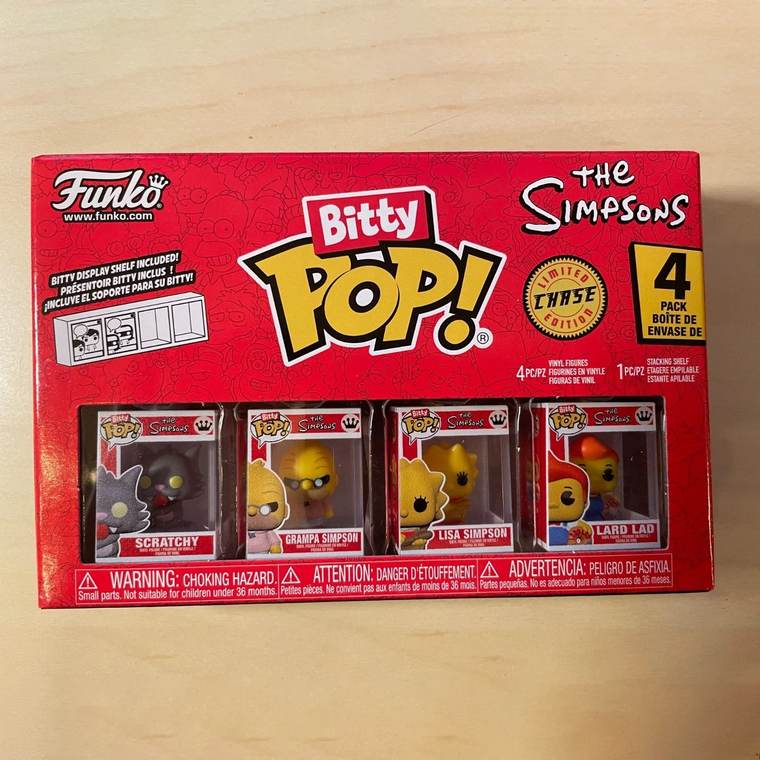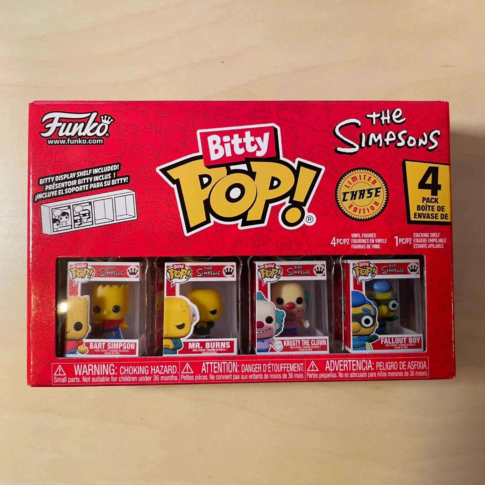Attribute1: The world of POP! is getting bigger-and smaller-with Bitty POP! collectibles! Expand your The Simpsons collection with this 4-pack featuring Bitty POP! Bart Simpson, Bitty POP! Mr. Burns, Bitty POP! Krusty the Clown, and a chase Bitty POP! collectible.
