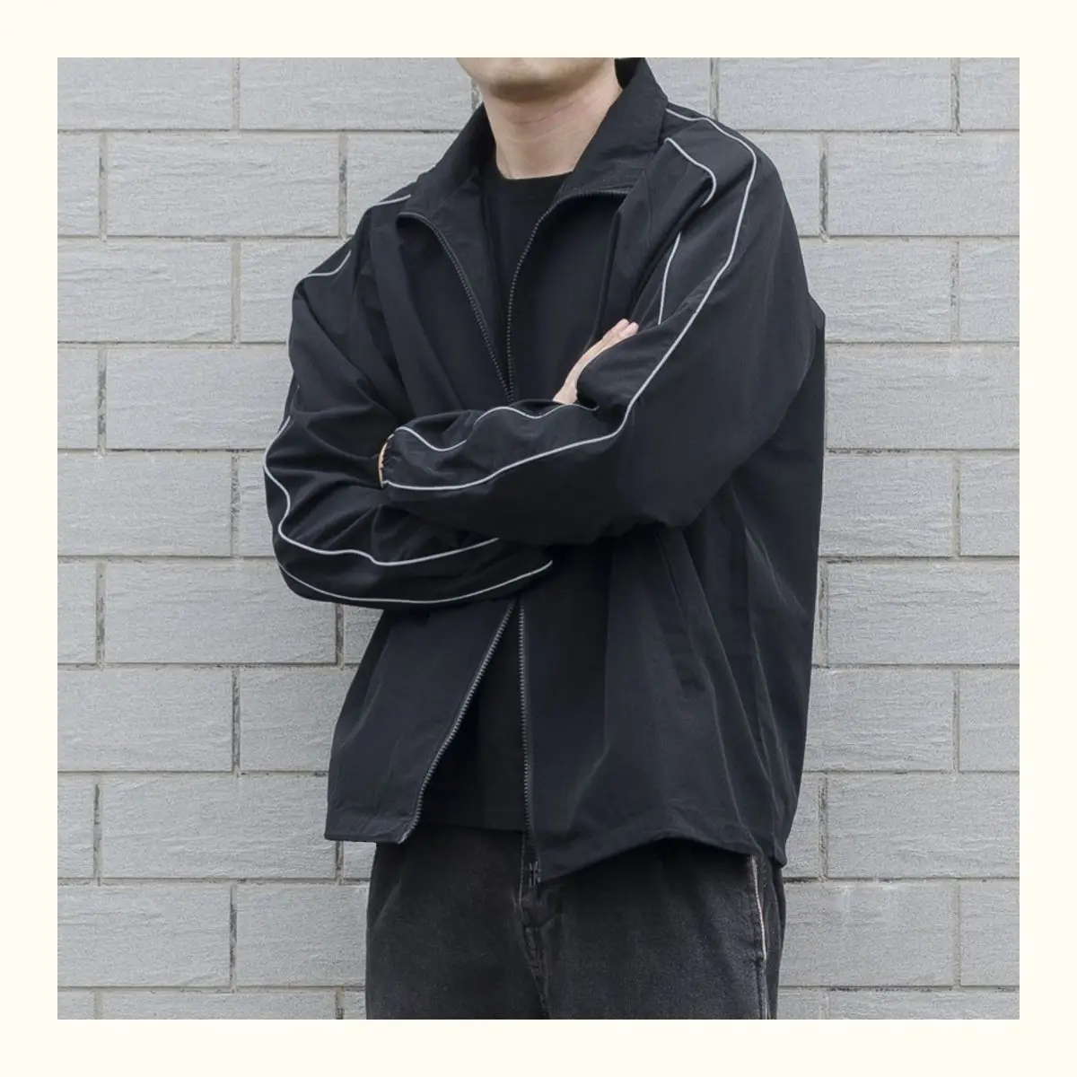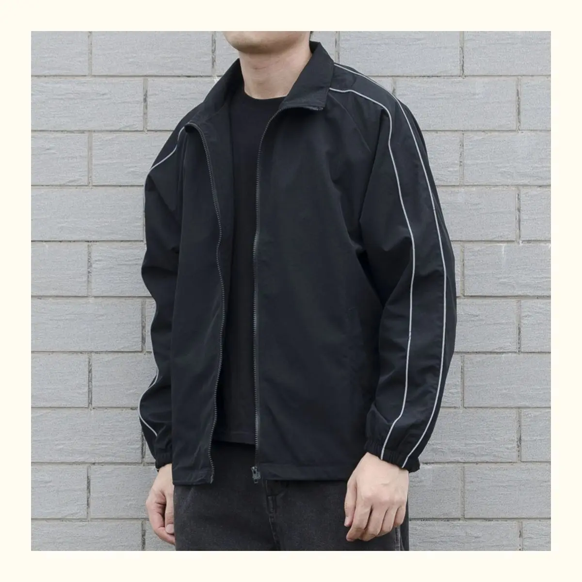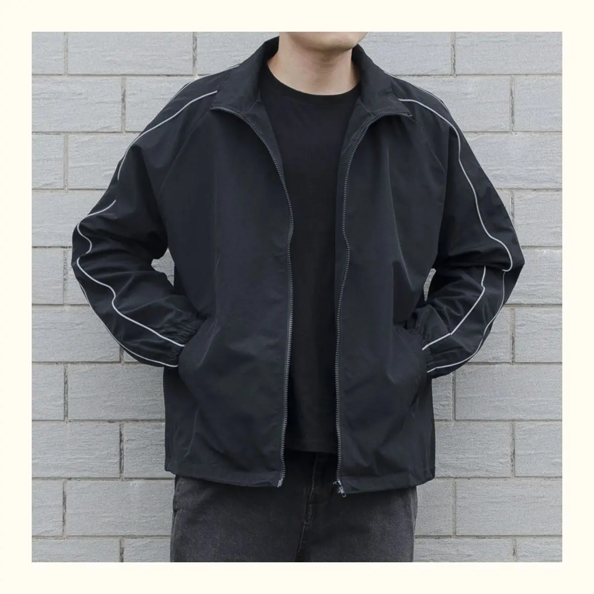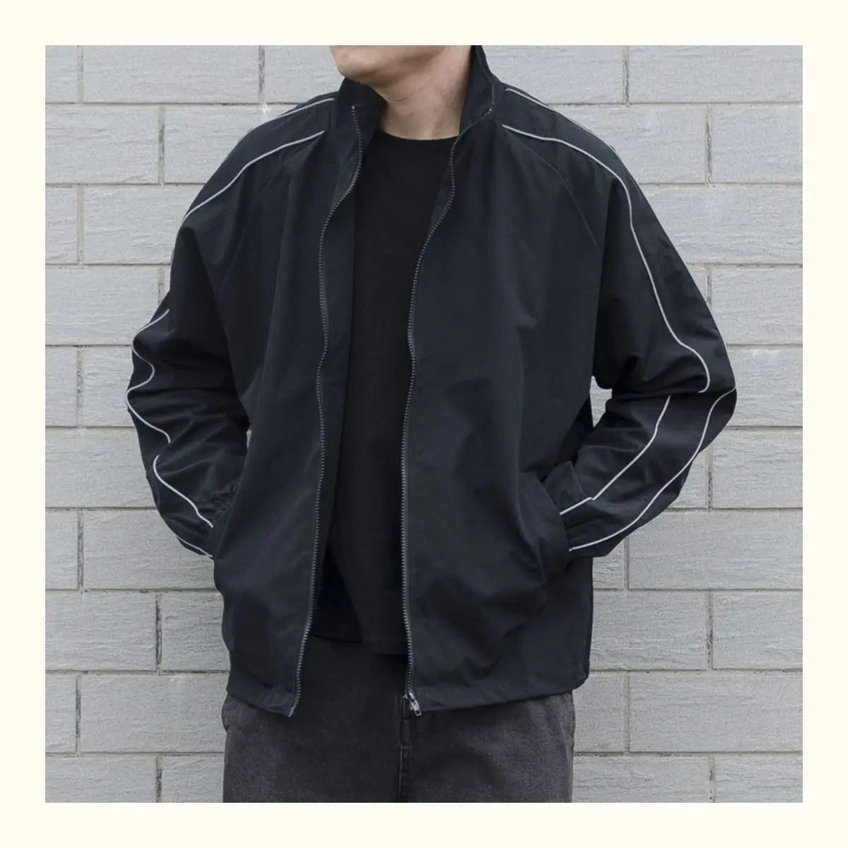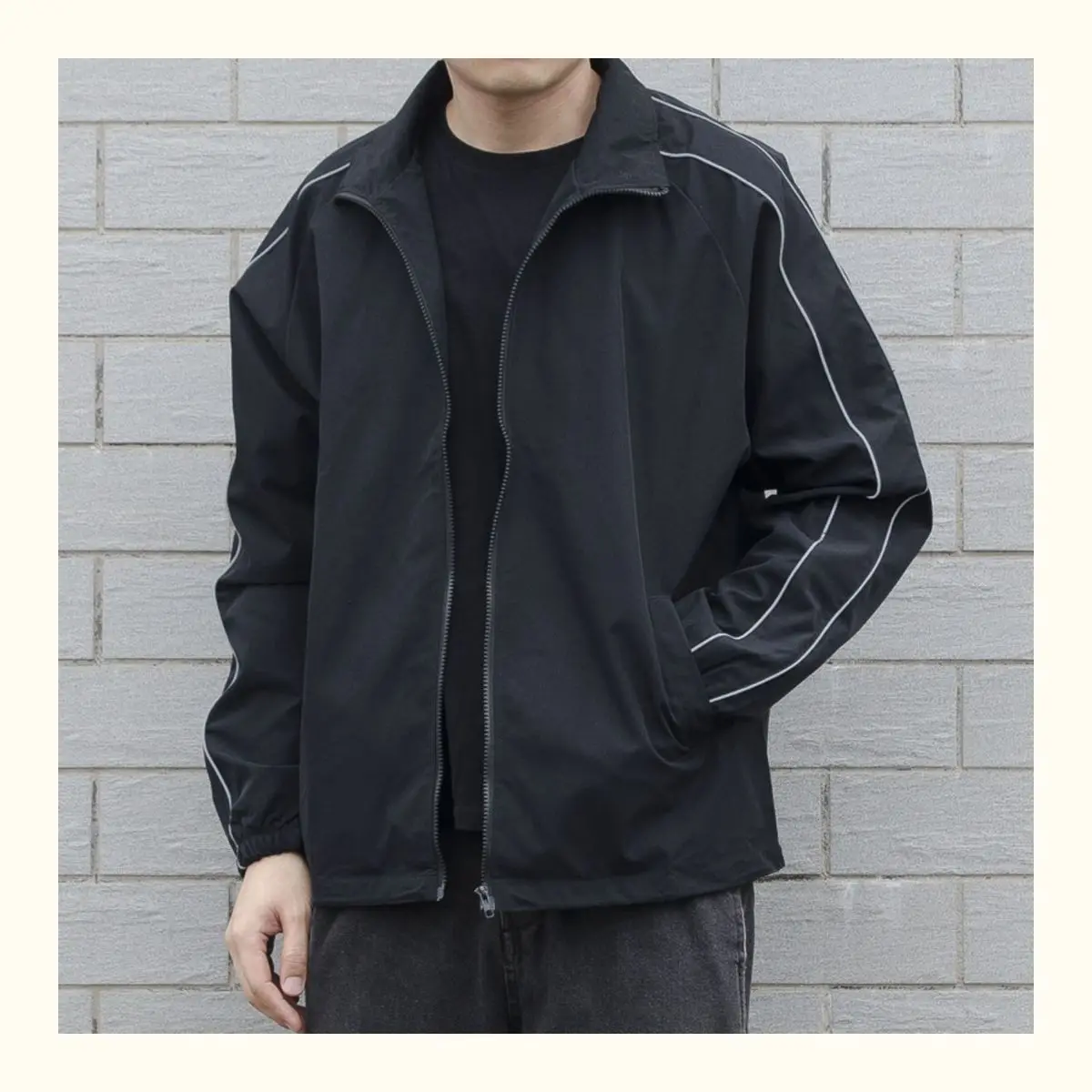 Blusão solto de retalhos masculino com bolsos, jaqueta bomber, zíper listrado, gola alta, impermeável, esportes ao ar livre, casual, outono