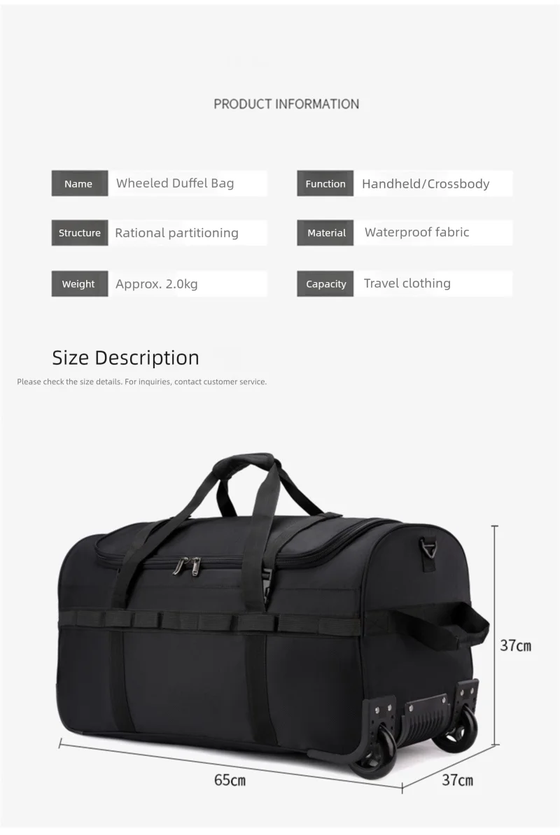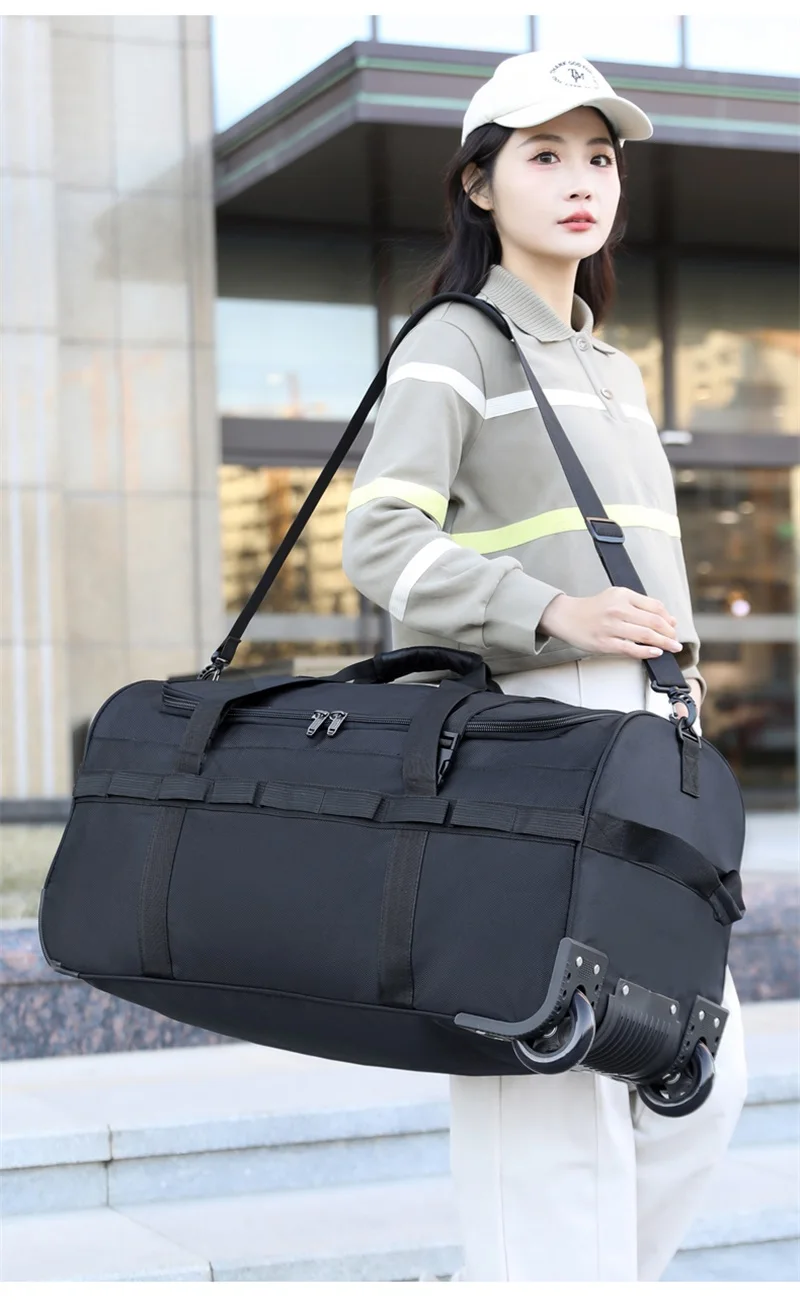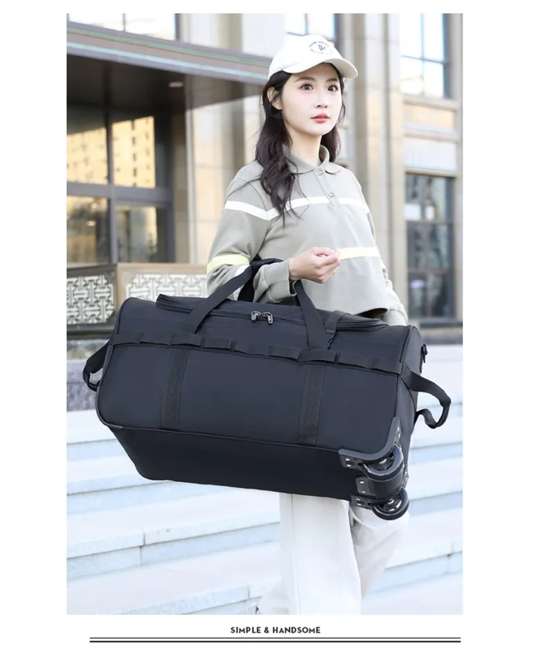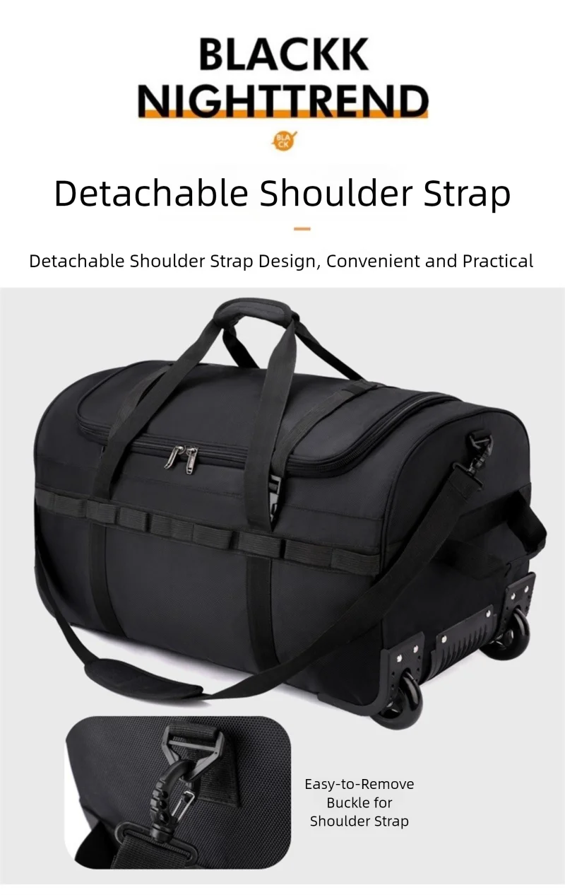 1.Bolsa de viagem multifuncional com rodas: projetada para necessidades versáteis de viagem, esta mochila com rodas resistente se converte em uma mochila com alças ajustáveis, perfeita para acampamentos, sessões de ginástica e aventuras de fim de semana.