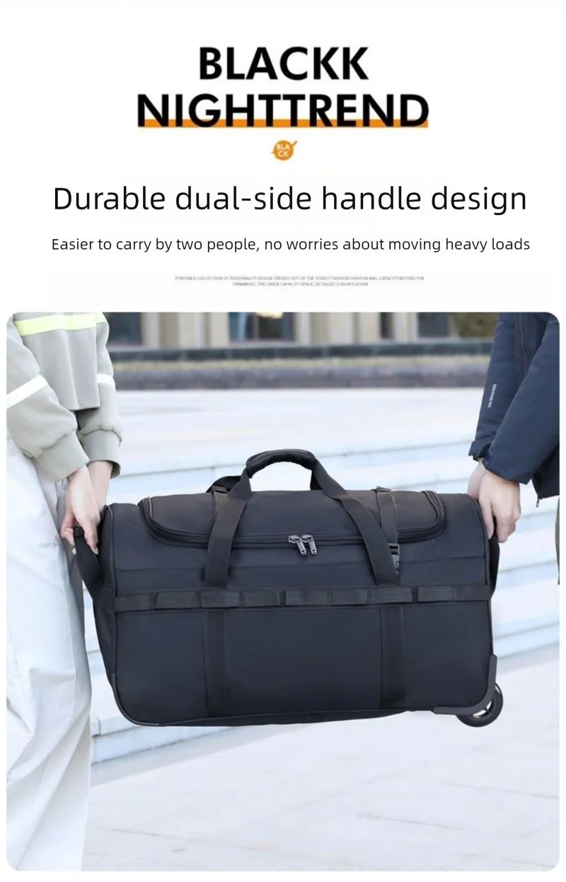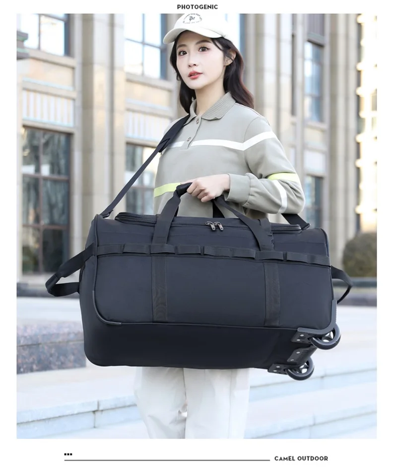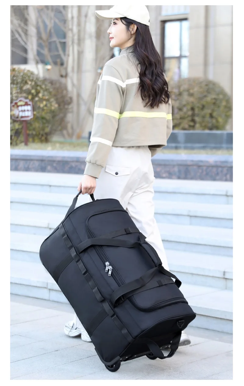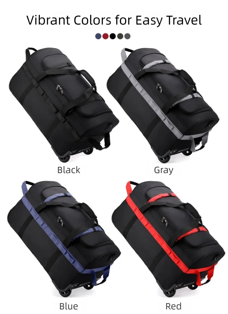 Bolsa de lona com rodas para serviço pesado, dobrável, resistente à água, bagagem com alça de ombro ajustável e bolsos para viagens, academia