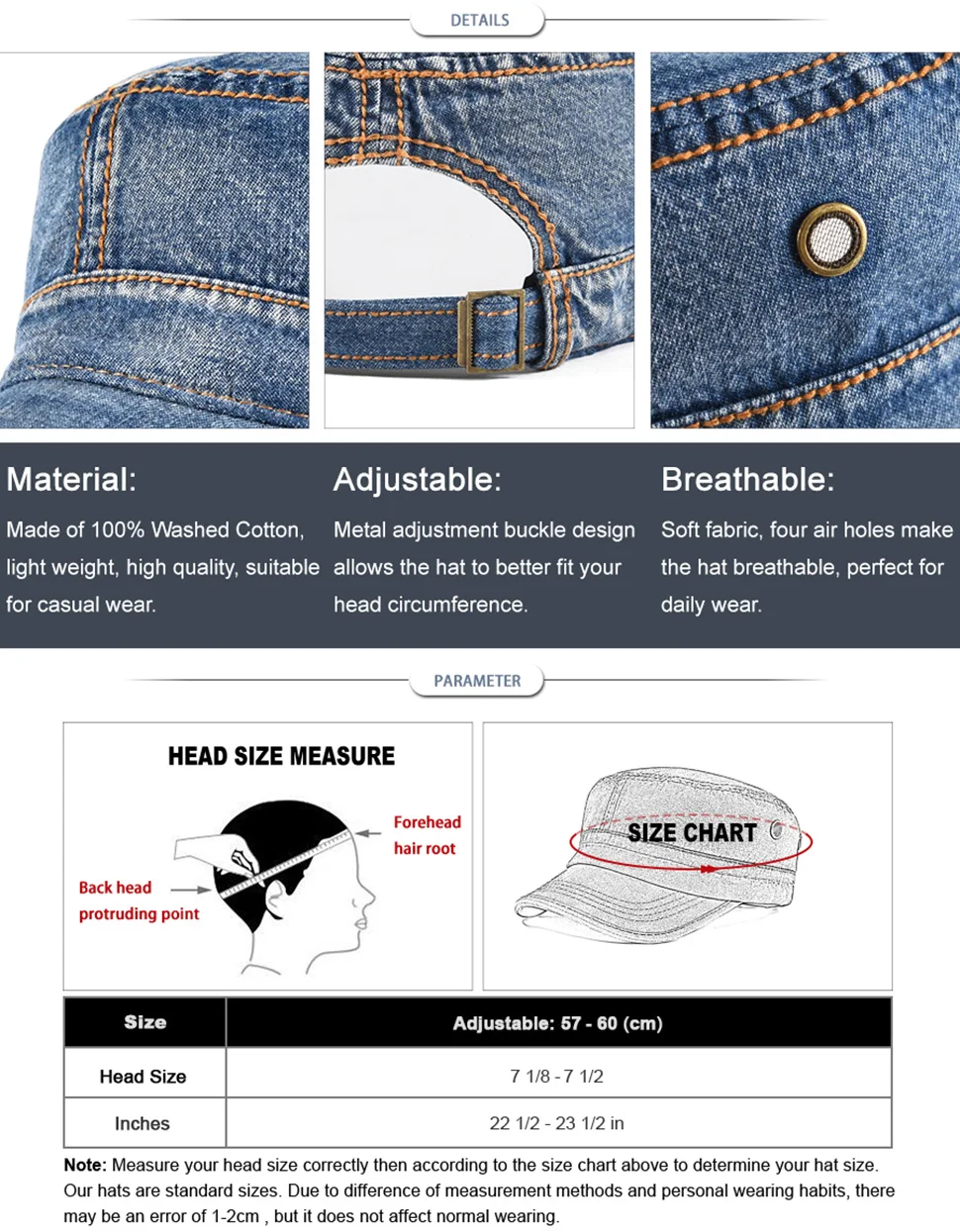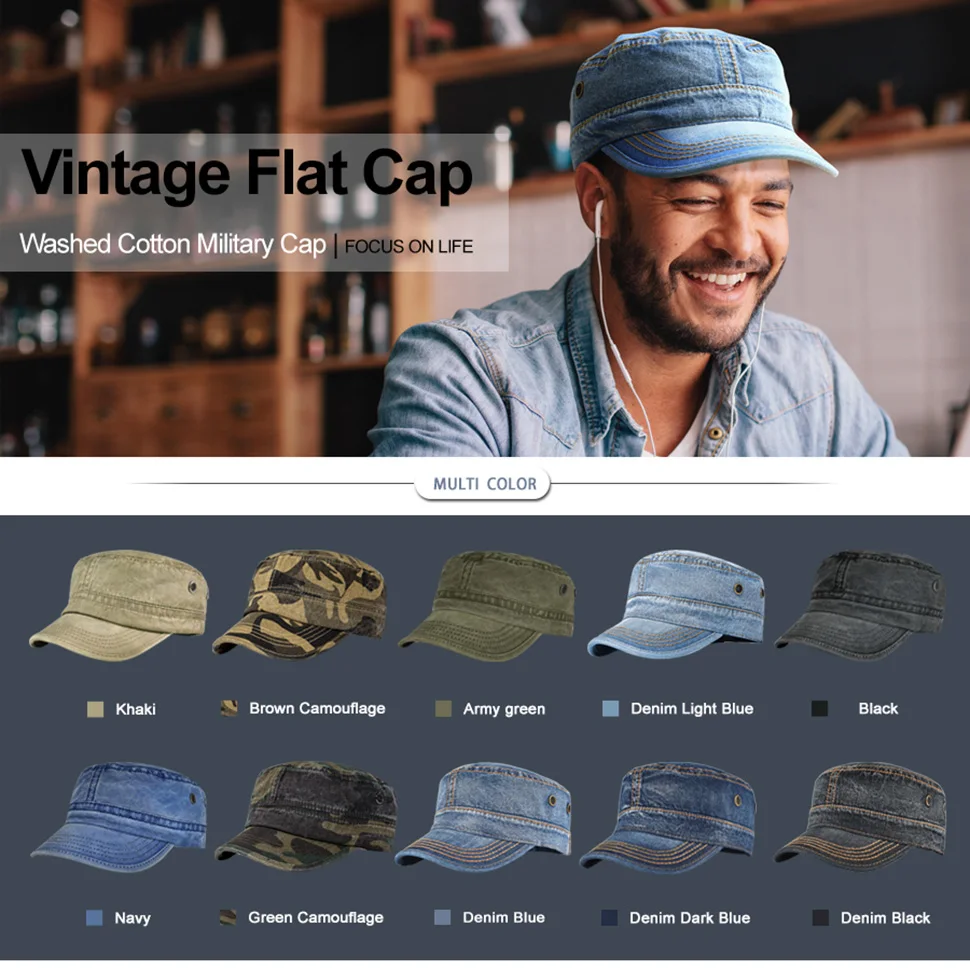 - > Bonés militares de cadete de algodão lavado VOBOOM para homens com design exclusivo ajustável vintage chapéus de topo plano com furo de ar